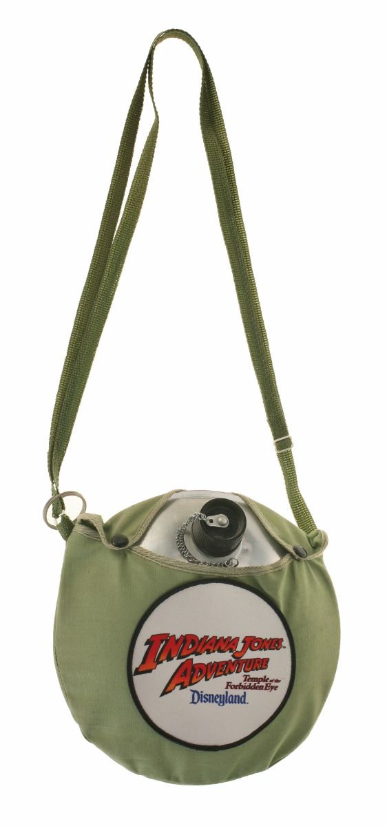 (Disneyland, 1995) A rare cast member prop used during the press preview day for the "Indiana Jones Adventure" attraction. Cast members added this special canteen to their standard costumes for increased visual appeal to the attraction during the preview. Measures 7.5" in diameter. In very good condition.