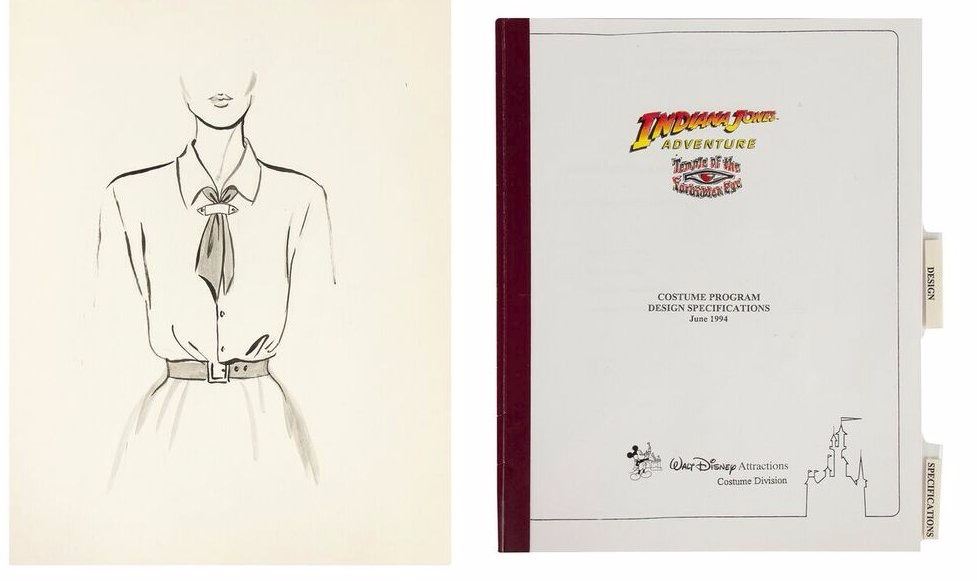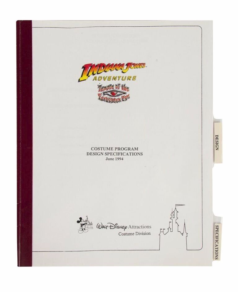 (Disneyland, 1994) A very scarce book from Disneyland's Costume Division titled, "Costume Program Design Specifications" for the "Indiana Jones Adventure" attraction. This booklet features the male and female cast member designs as well as details on the costumes such as descriptions, sizes, and materials used. This 9-page booklet measures 11"x8.5" and is in very good condition with little wear. Also included with this booklet is an original ink drawing for aspects of the female cast member costume. The drawing measures 11"x8.5" and is in very good condition.
