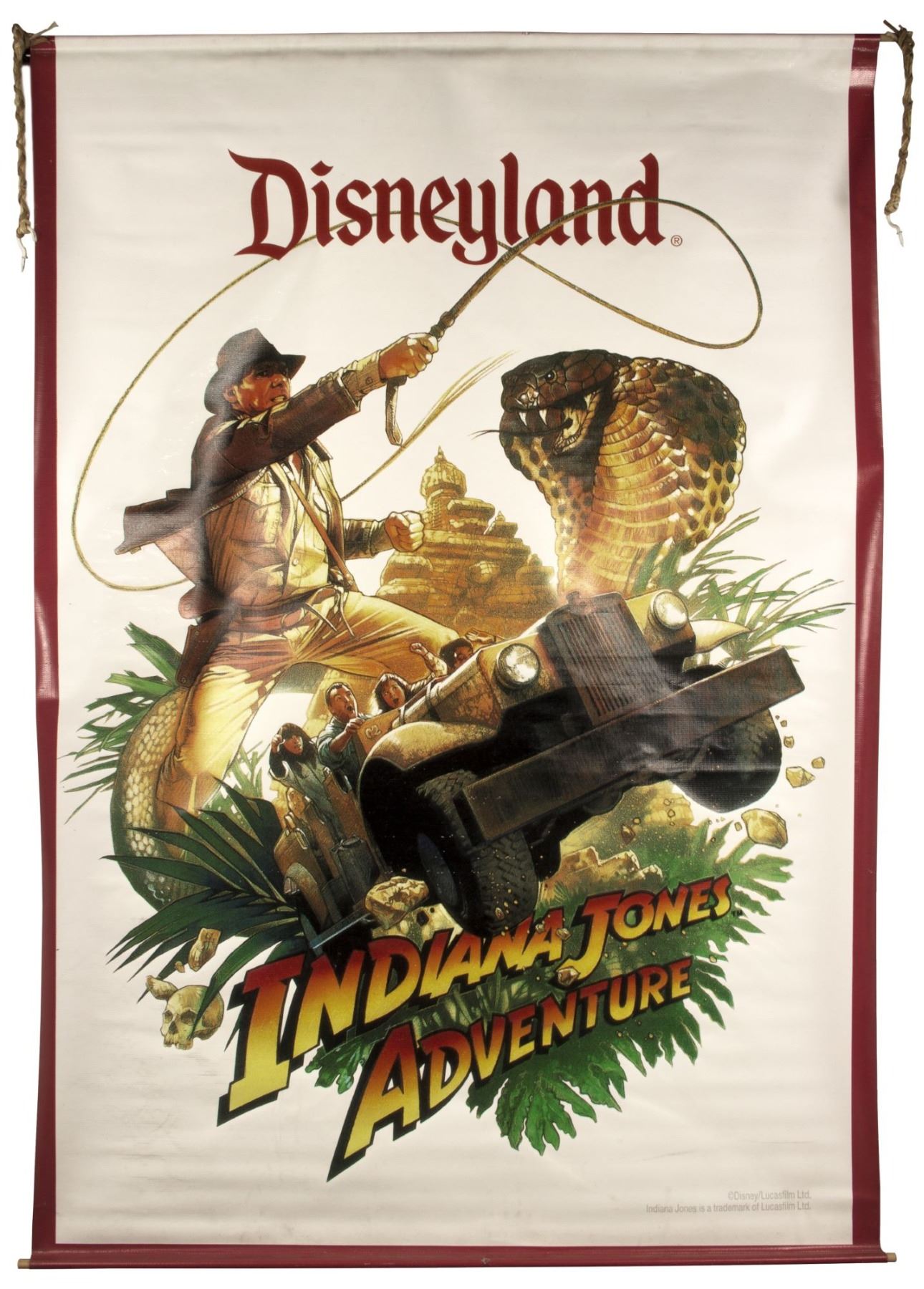 (Disneyland, 1995) An original double-sided banner used to promote the Indiana Jones Adventure at Disneyland. This fantastic banner features imagery of Indiana Jones brandishing his whip, a hissing cobra, and a ride vehicle full of passengers on both sides. Measuring approximately 68.5"x41", the banner is in good to very good condition with some spots of discoloration and some edge-wear from use, including a few small tears.