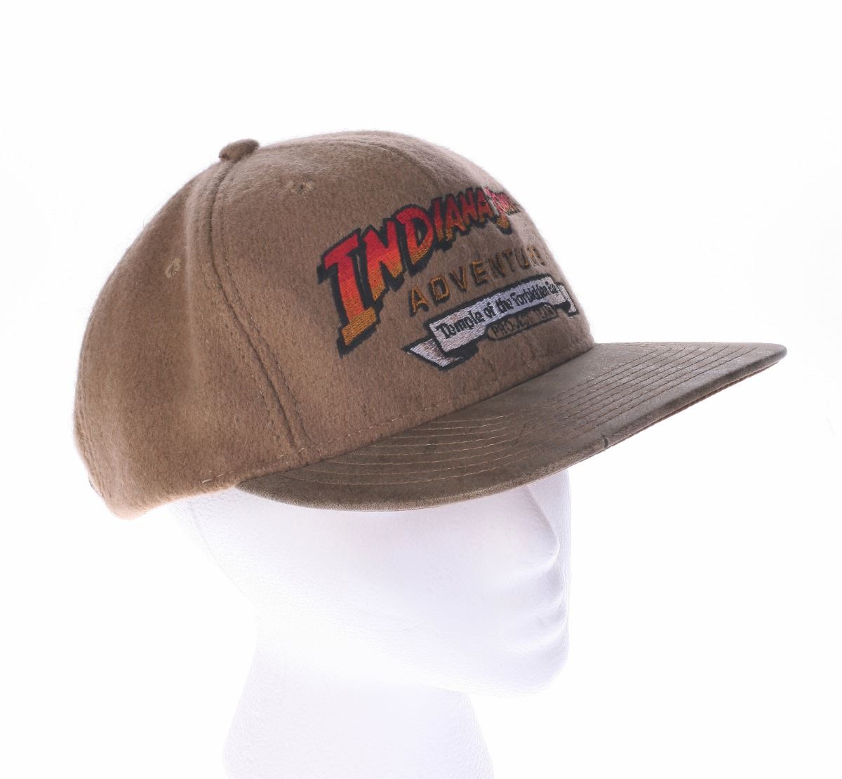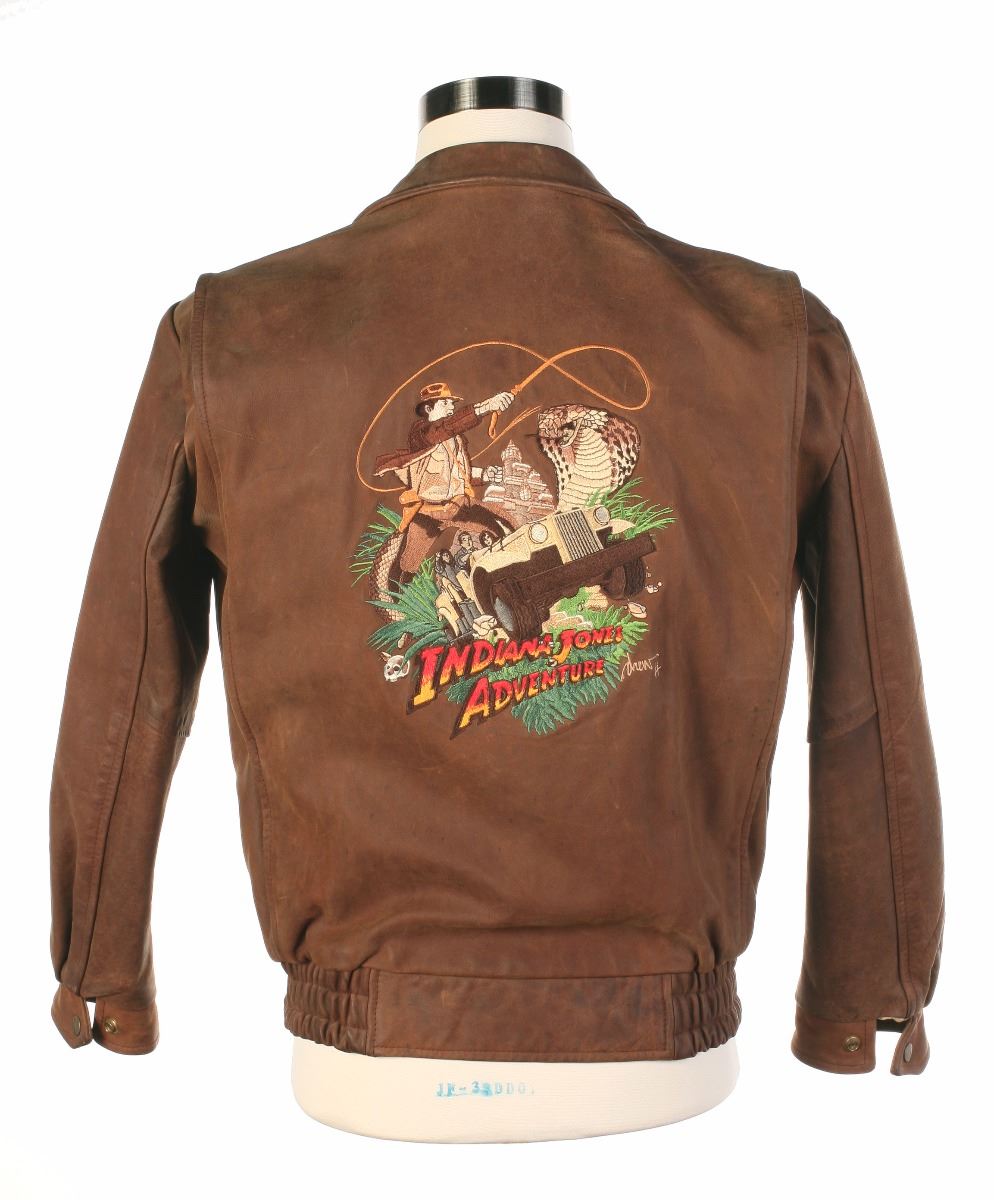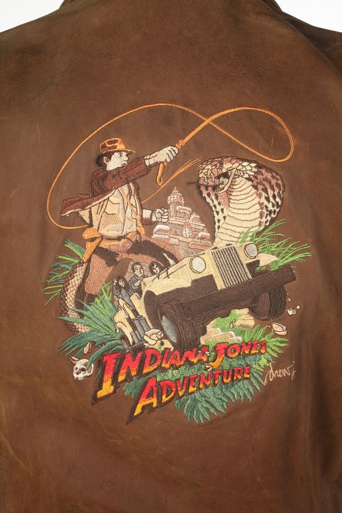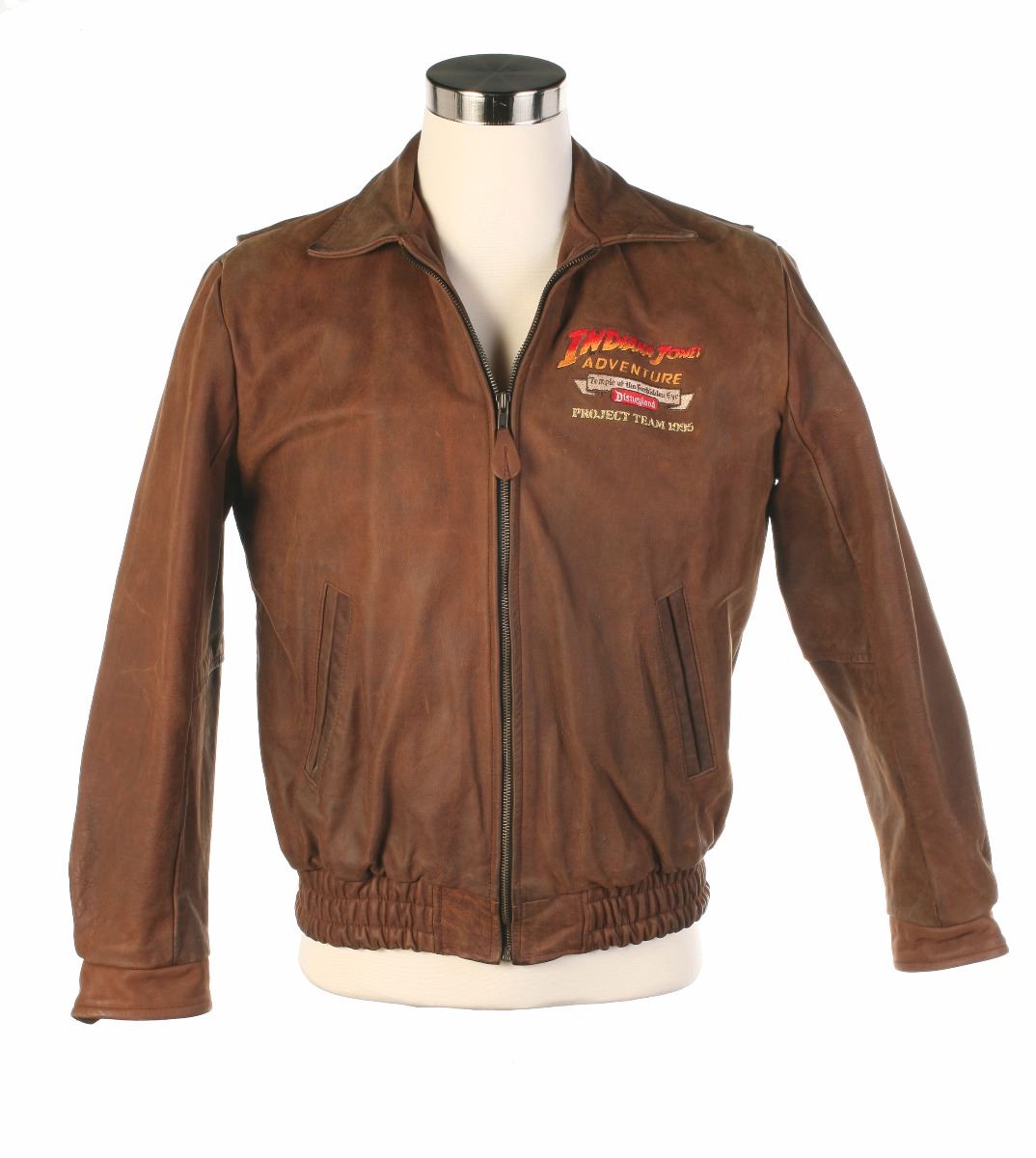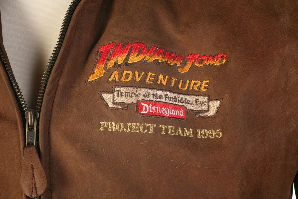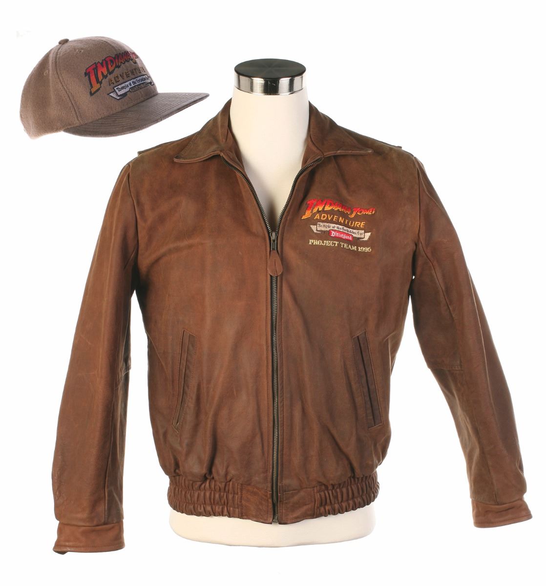 (Disneyland, 1995) Sturdy leather jacket with "Indiana Jones Adventure" logo embroidery on the chest and on the back. Reads "Indiana Jones Adventure - Temple of the Forbidden Eye Project Team". The lining on the back is a map featuring the deity Mara from the attraction. Only 20 of these jackets were produced, and were exclusively awarded to the Imagineers who worked on the attraction. Comes with matching "Indiana Jones Adventure Project Team" hat. Jacket is size Medium. Set is in very good condition.