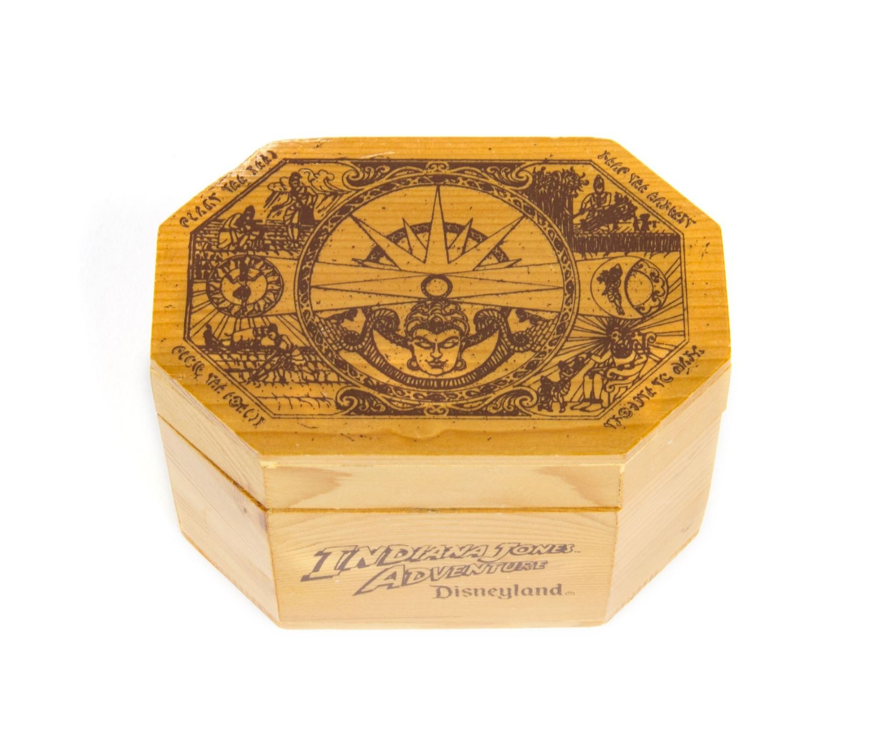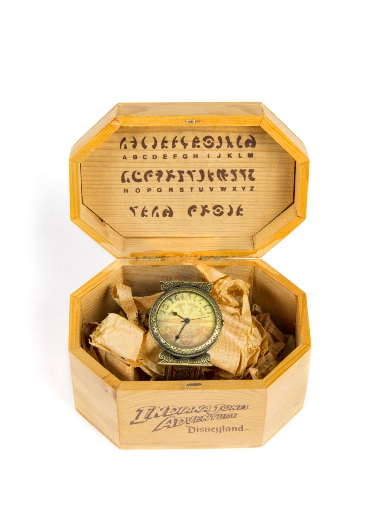 (Disneyland, 1995) A limited edition watch created for members of the creative team behind Disneyland's "Indiana Jones Adventure" attraction. The watch is numbered 2941/3000 and reads "Team Pride" on the back in the Mara Temple Language seen throughout the attraction. The watch box decodes the language inside the lid. The watch measures 8" long and is in good condition, but does not appear to be functioning.
