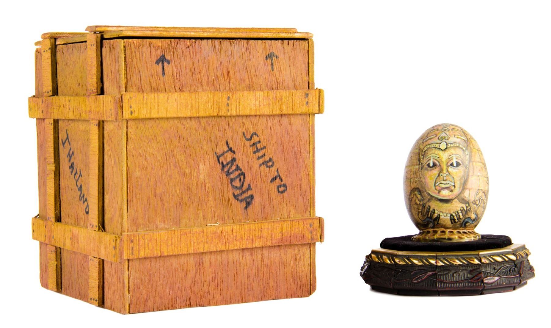 (Disneyland, c.1995) A one-of-a-kind hand-painted egg featuring Mara from "Indiana Jones Adventure". This egg is believed to have been created to commemorate the new Disneyland attraction, and the egg comes in a small wooden crate. Measuring 3.25" in diameter and 3.5" tall on its custom base, the egg is in very good condition with little wear.