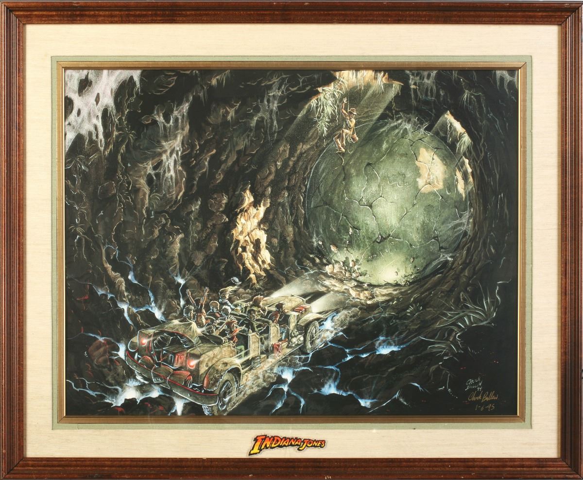 (Disneyland, 1994) Custom framed print from the Disney Gallery at Disneyland featuring concept art from the "Indiana Jones Adventure" attraction by Imagineer Chuck Ballew, the creator of the iconic Mara Temple language seen throughout the attraction. Measures approximately 27"x32" framed. In very good condition with minor wear to the frame from display. Signed by the artist in the lower right corner.