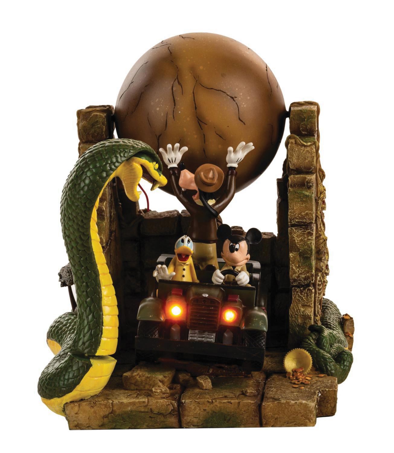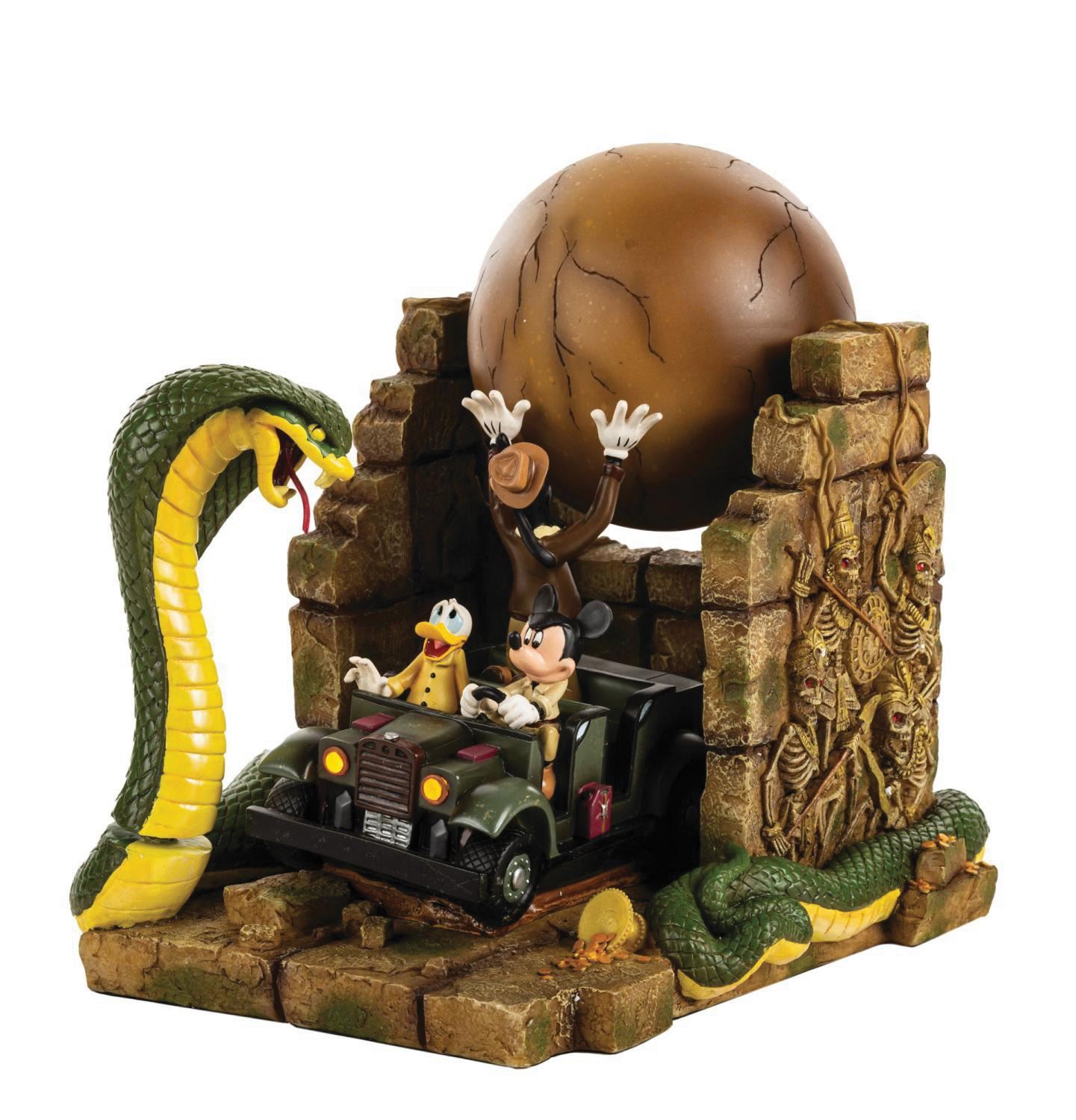 (Disneyland, 2005) An Indiana Jones Temple of the Forbidden Eye figurine offered during the 10th anniversary of the attraction. Mickey Mouse, Goofy, and Donald Duck outrun the perilous spring-activated trappings and giant serpent of the Lost Delta ruins. Measuring 8.25" tall, the figure displays in fine condition. It features moving parts and working headlights and comes complete in the original box.