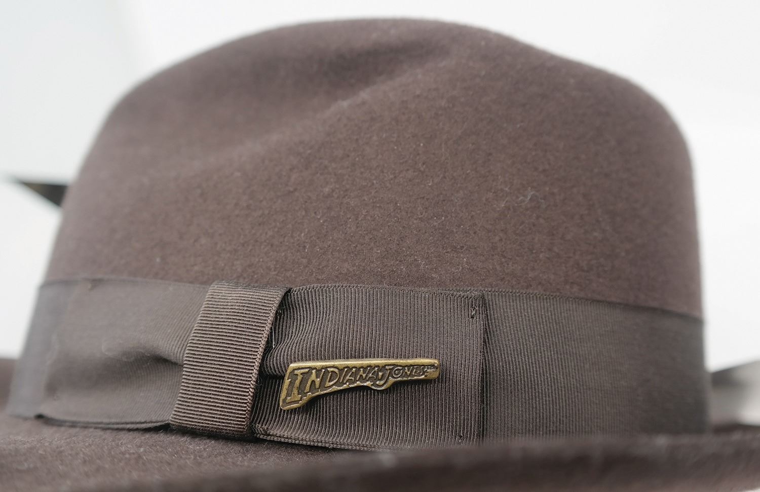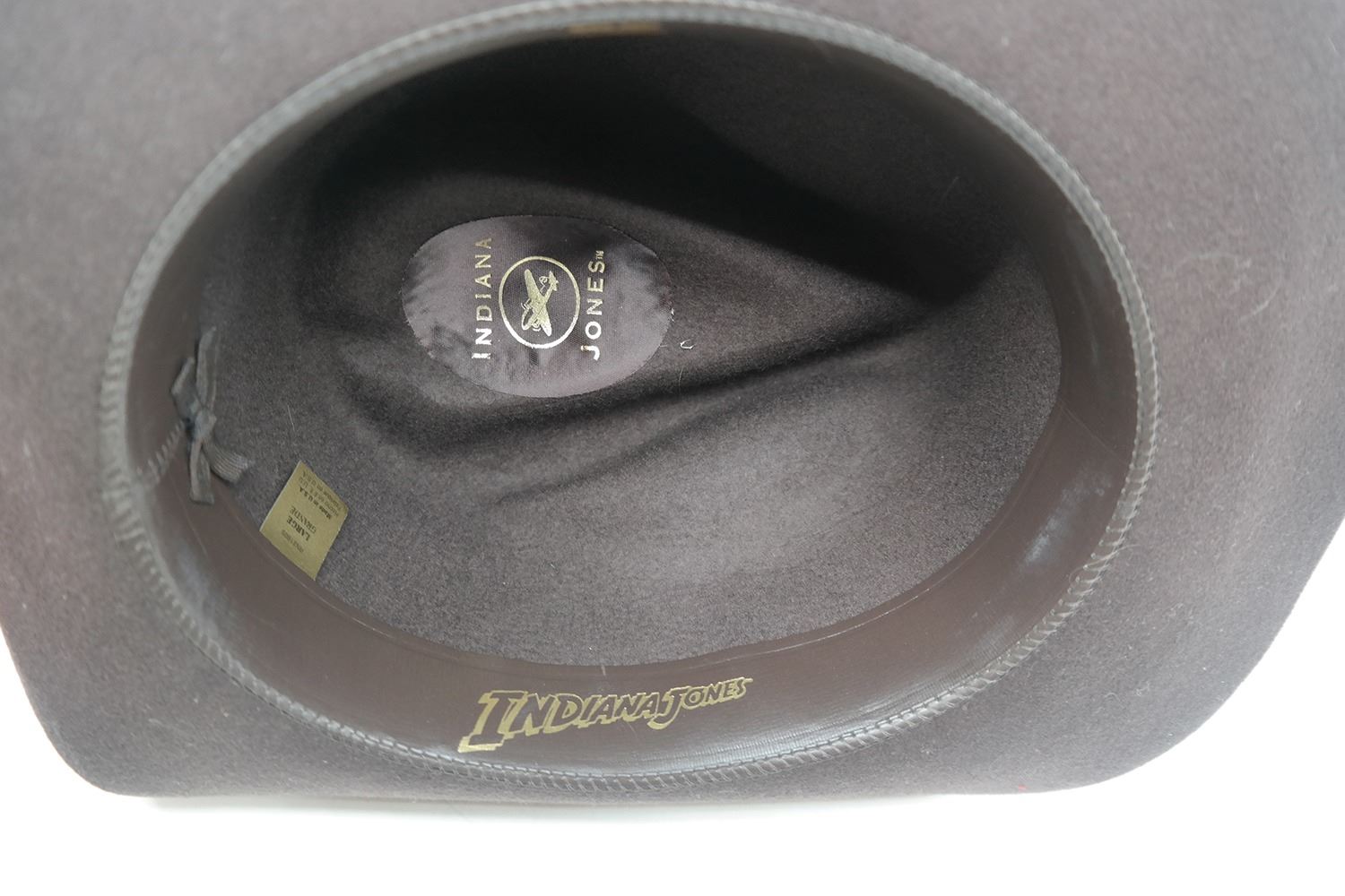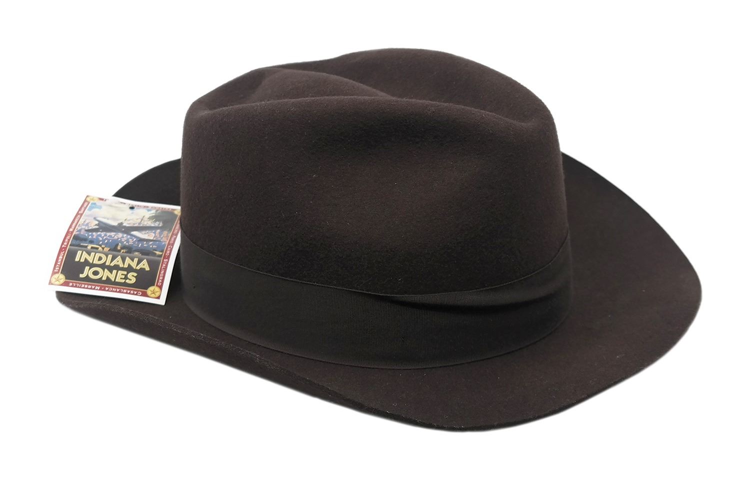 (Disney-MGM, c.1990s) An Indiana Jones souvenir hat from the Indiana Jones Outpost at Disney-MGM Studios. Made from wool felt, the hat has a ribbon band with an Indiana Jones pin attached. The hat is a size large, and has an 8" opening and a 13.5" overall length. The hat is in very good condition with minimal wear, and still has the original Dorfman Pacific tag attached.