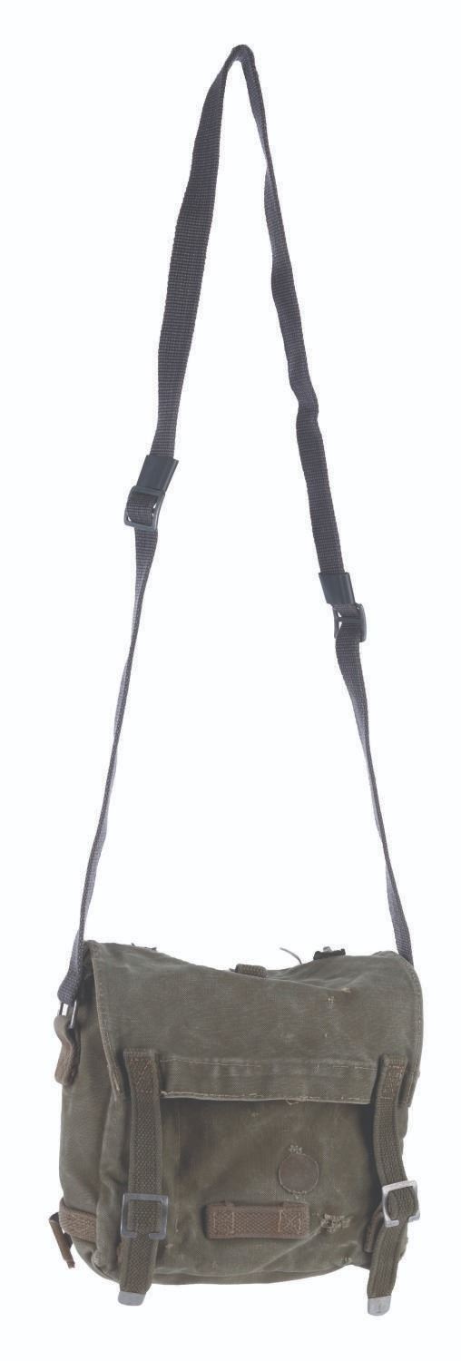 (Paramount, 1984) An Indiana Jones-style bag, gifted to the Director of Photography while on location filming Indiana Jones and the Temple of Doom. Douglas Slocombe, the film's Director of Photography, received this bag as a gift from either Steven Spielberg or George Lucas. While the canvas bag has no branding, it was recognized and given as the type of equipment Indiana Jones would carry. Measuring 4"x8.5"x11" with shoulder strap, the canvas bag is in good used condition, with some wear from field use, especially to (4) short straps on the back.