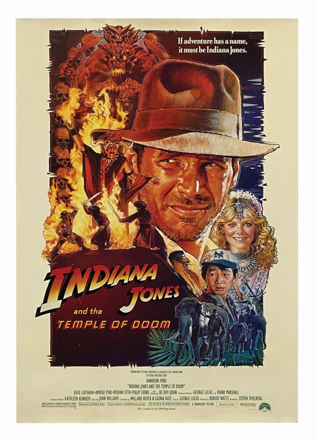 (Paramount, 1984) A vintage Indiana Jones and the Temple of Doom one sheet poster. Featuring art by Drew Struzan, the composition takes inspiration from poster designs for the adventure serials of the 1930s and 40s on which the Indy series is based. Measuring 40"x27", the poster is in very good with minor edge wear.