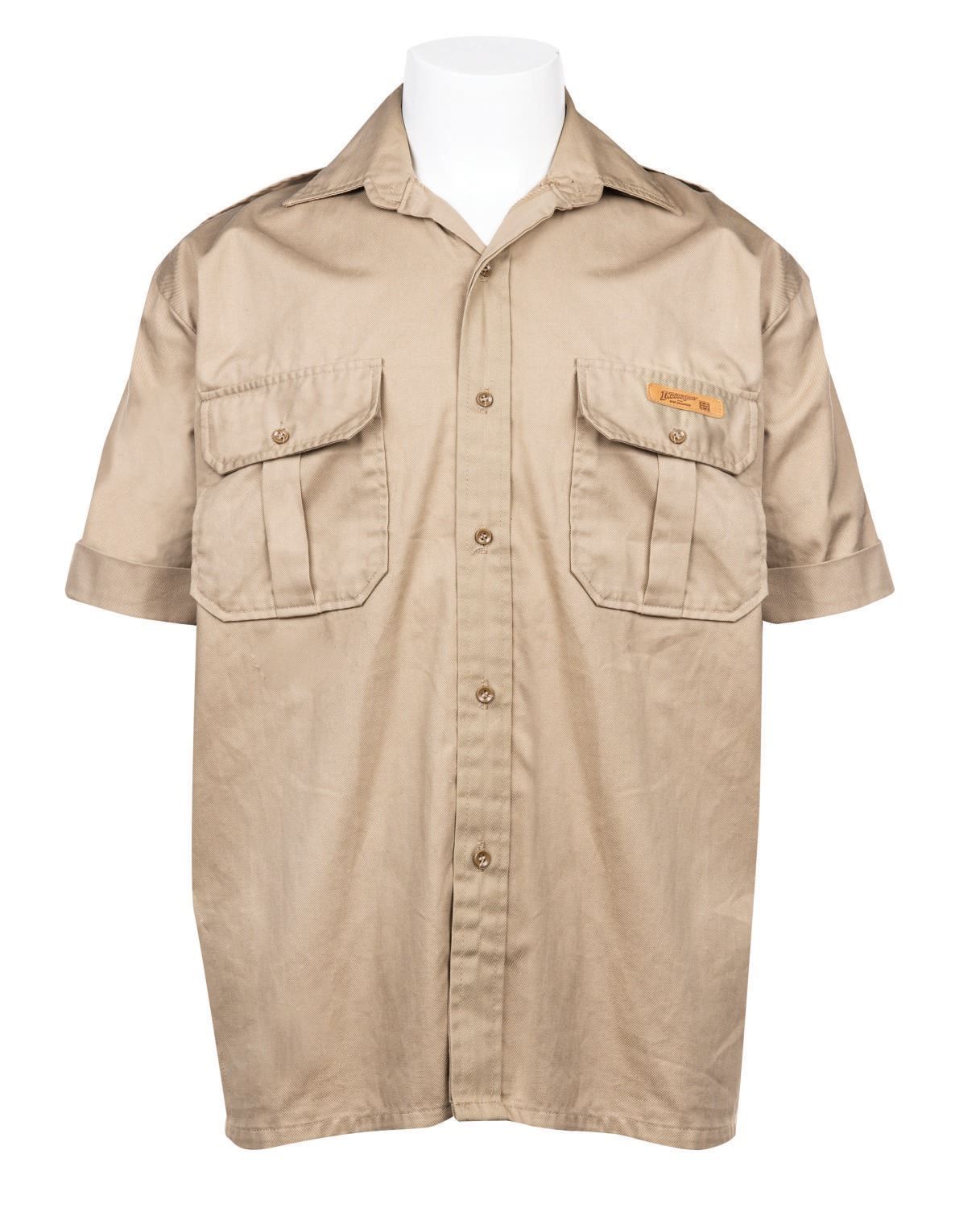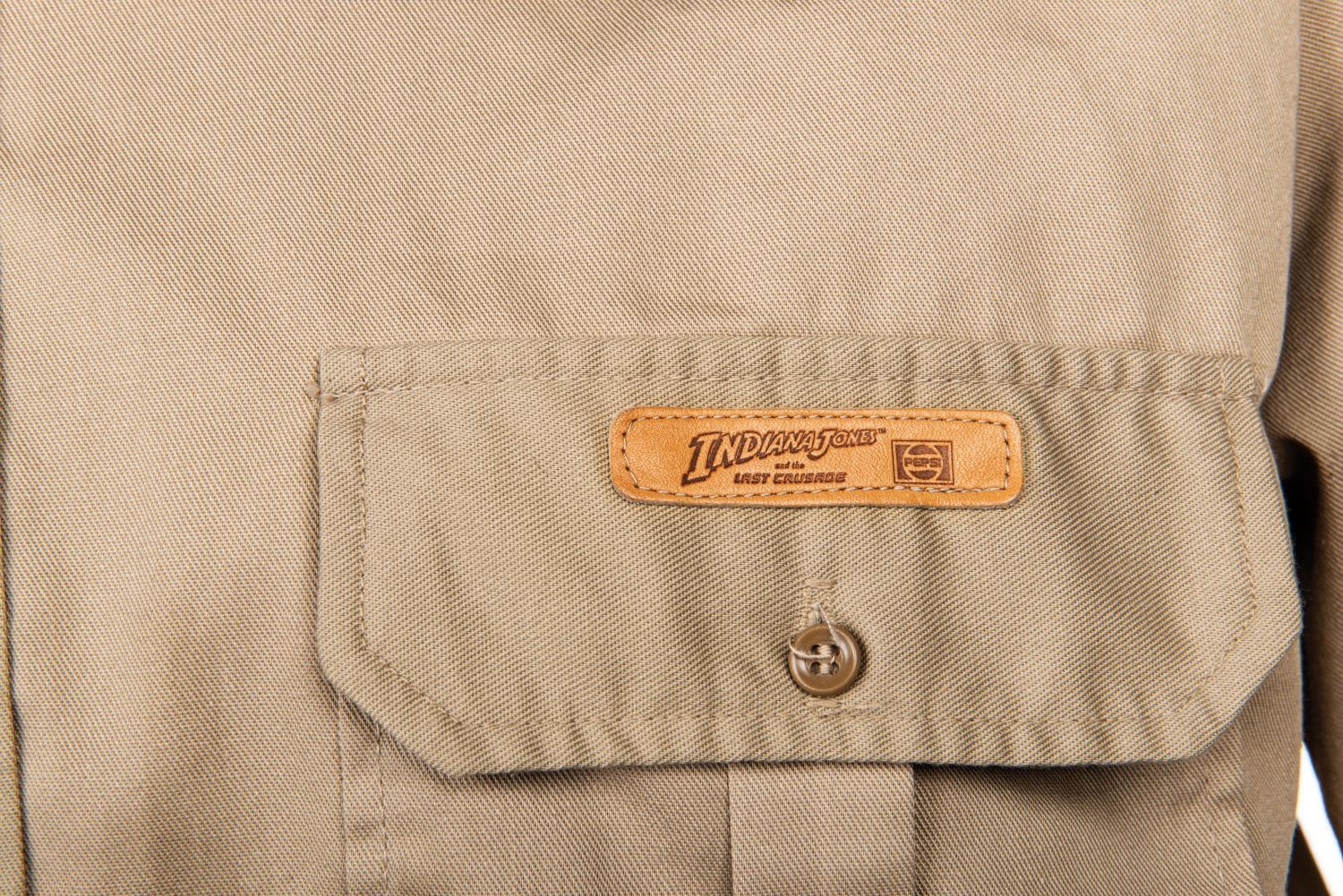 (Lucasfilm, 1988) An exclusive shirt made for the crew of the third installment of the popular Steven Spielberg and George Lucas Indiana Jones franchise. The cotton and polyester khaki short-sleeved shirt features a small leatherette "Indiana Jones and the Last Crusade" logo and Pepsi emblem on the left breast pocket flap.The shirt is in very good used condition.