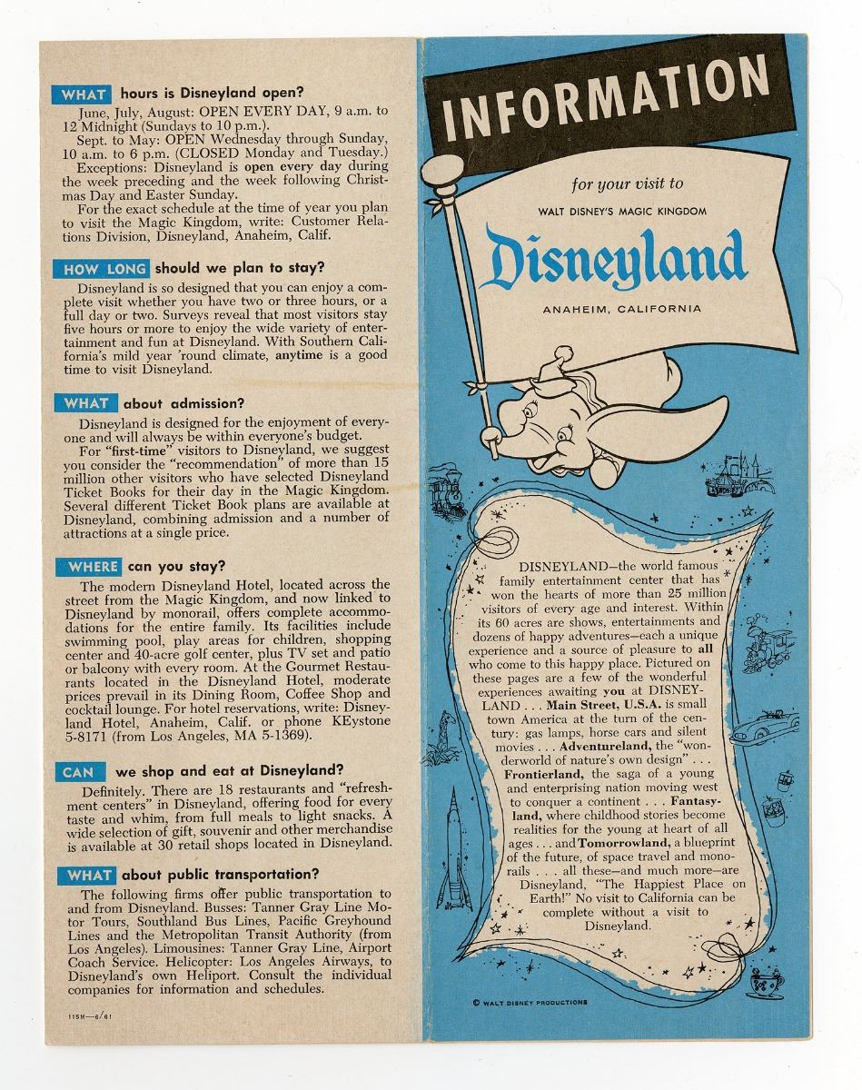 (Disneyland, 1961) Information on Disneyland fold-out distributed throughout Southern California with information on the park and how to get there. The interior features color photos of attractions in the park. Measures 9"x14", unfolded. In good condition with some wear and creasing.