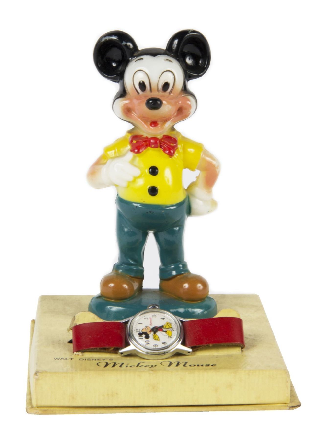 (Ingersoll, c.1958) A very rare Ingersoll watch display featuring a hard plastic Mickey figure behind a Mickey Mouse watch. The watch appears to be in good working order, but extensive testing has not been done. The Mickey figure rests within a groove in the yellow base. The watch strap measures approximately 7" long, and the display measures 6" tall. The condition is very good overall, with some separation of the red layer of the leather strap, and some general wear throughout the display from age.
