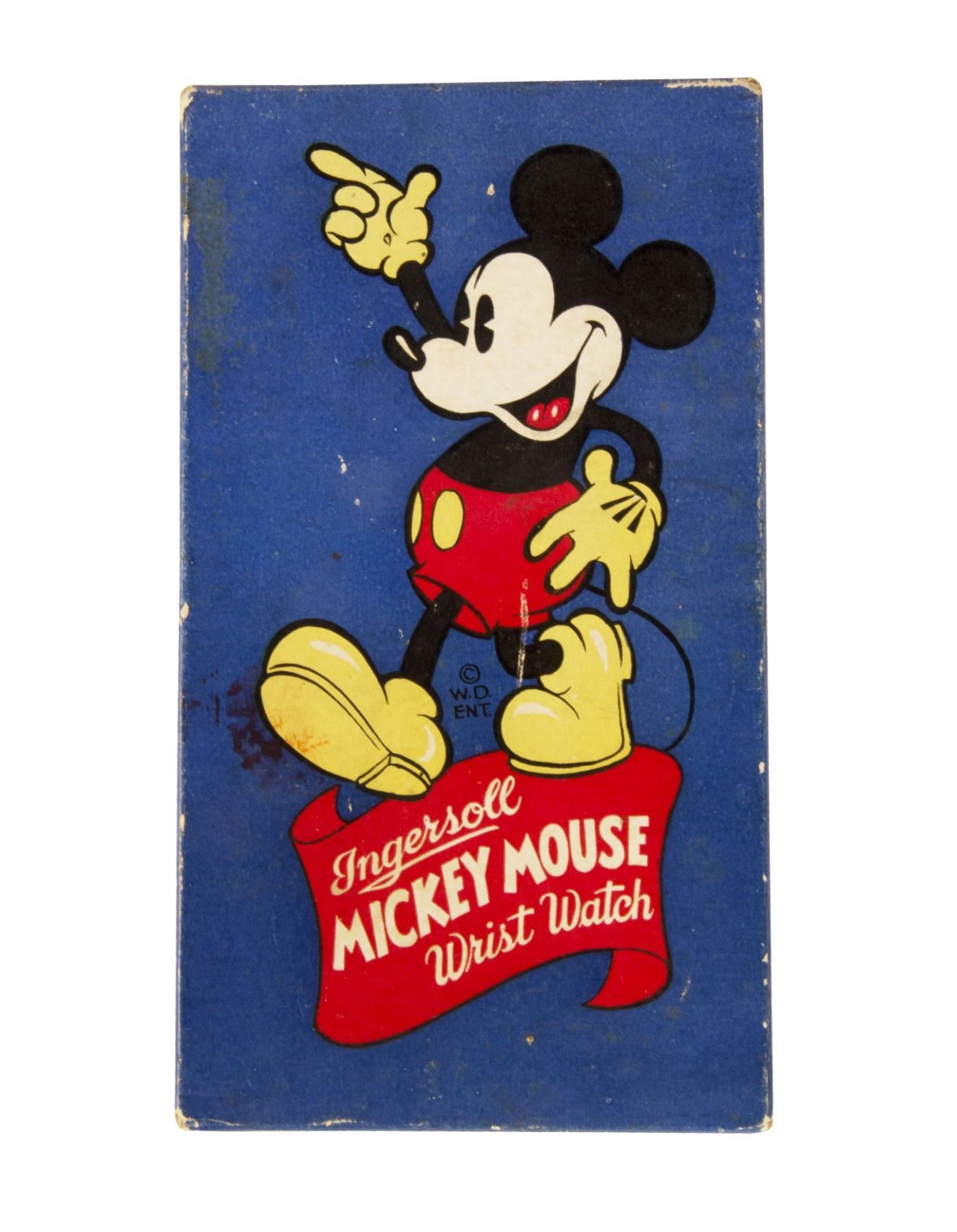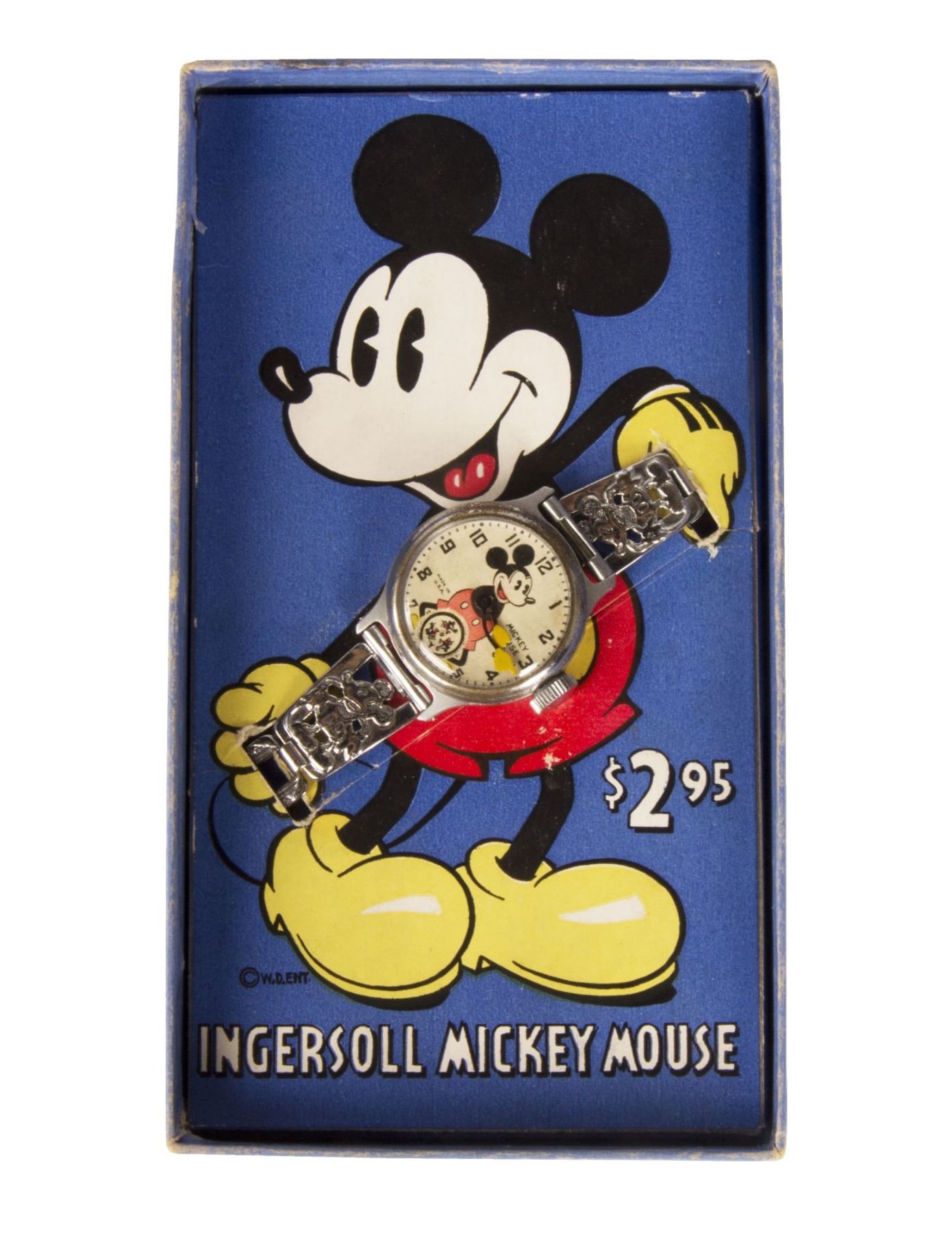 (Ingersoll, c.1935) A rare Ingersoll watch featuring Mickey Mouse in the center with his arms as the watch hands. The watch comes in its original box with the price of $2.95 advertised inside. The face of the watch measures 1.25" in diameter, and the band measures 7" long. The condition is very good, with some tarnishing around the face of the watch and a small stain between one and two o'clock, as well as some general wear from age. The watch is still in good functioning condition.