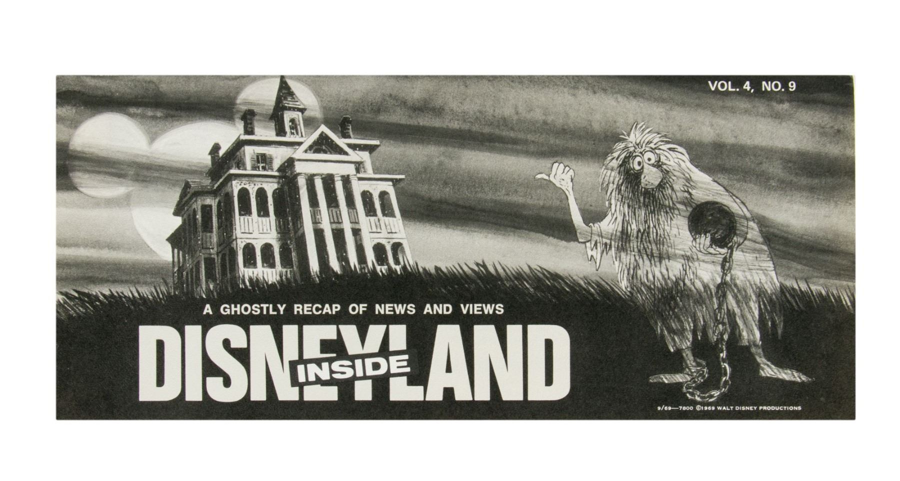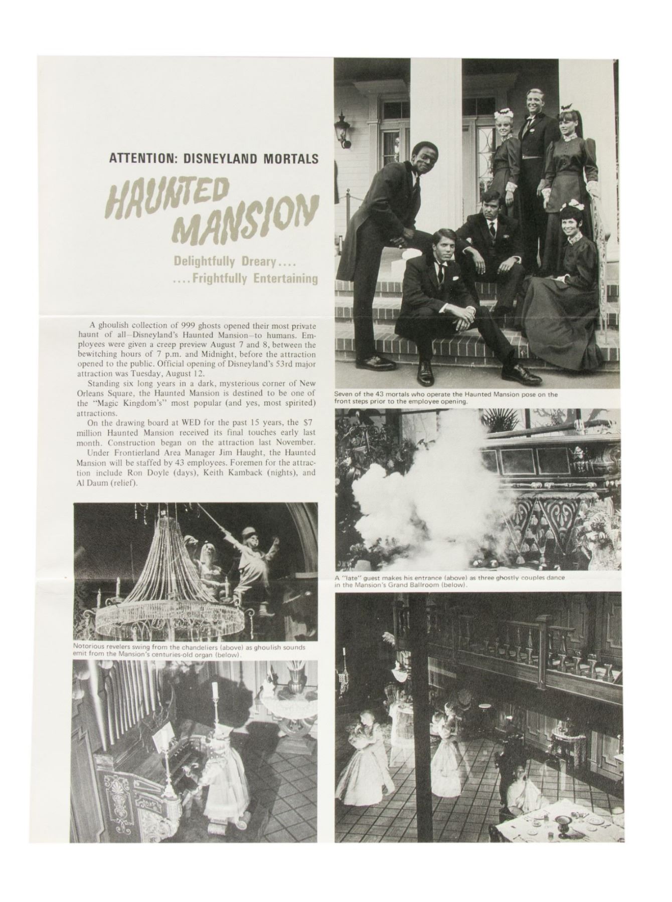 (Disneyland, 1969) A special edition of "Inside Disneyland" featuring information on the newly opened "Haunted Mansion" and it's Cast Members. This special publication measures 4"x9" while folded, and is in very good condition. The front of the publication has an image of the Mansion and Hitchhiking Ghost, while the back has the iconic Hatbox Ghost.