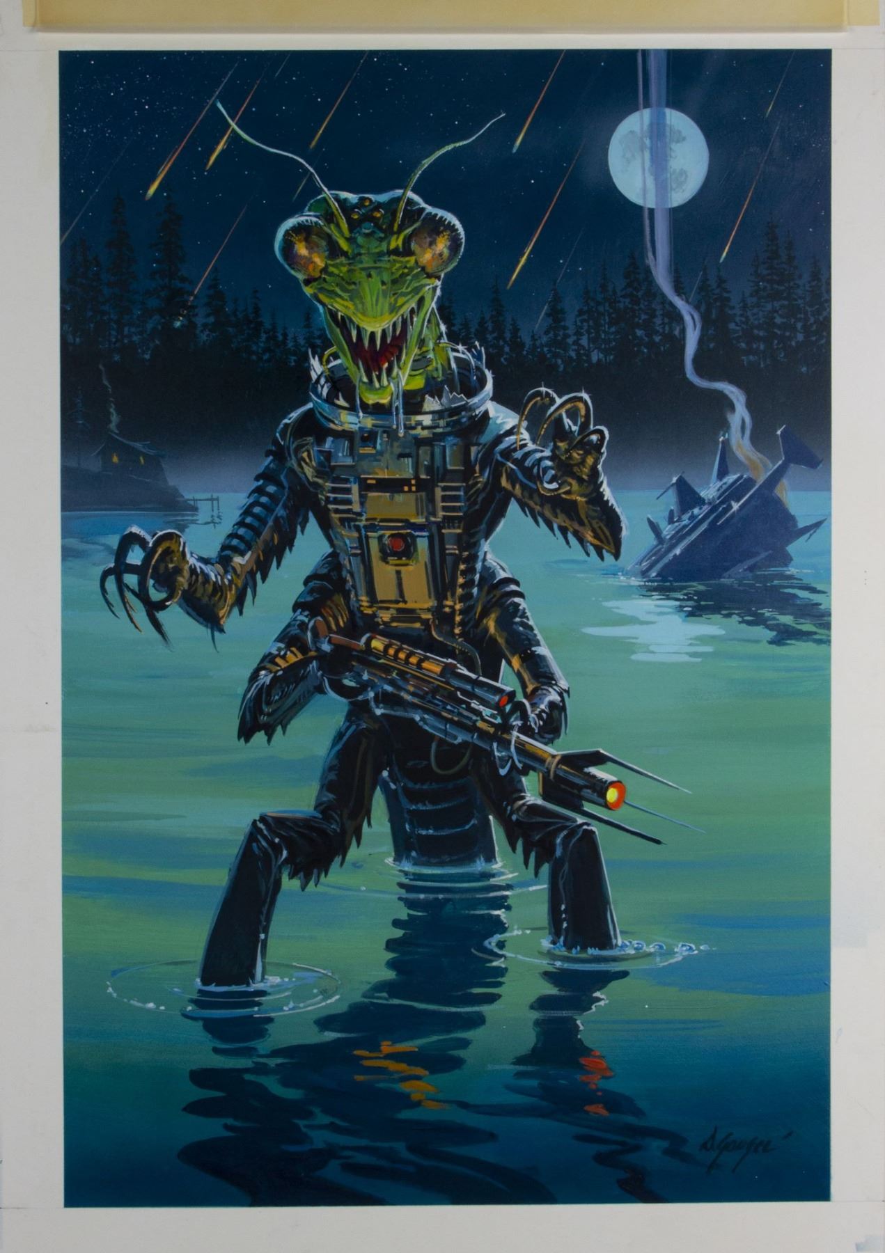 (Thought Factory, c.1977) An original painting by award winning visual effects artist and painter Dan Goozee. Titled "Invasion", this original artwork was used in a series of science fiction posters that were created and marketed by a partnership between Bill Wallen and Thought Factory in the late 1970s. The painting comes from Wallen's personal collection, and Goozee's influence from the iconic alien invasion films on the 1950's can clearly be seen throughout this stunning original painting. The artwork has an image size of 34"x23" on 40"x30" art board, and the condition is very fine with some wear to the edges and white margin areas of the board. There is a protective paper cover hinged over the top of the artwork that has some tearing throughout. Goozee has signed the bottom-right corner of the artwork.