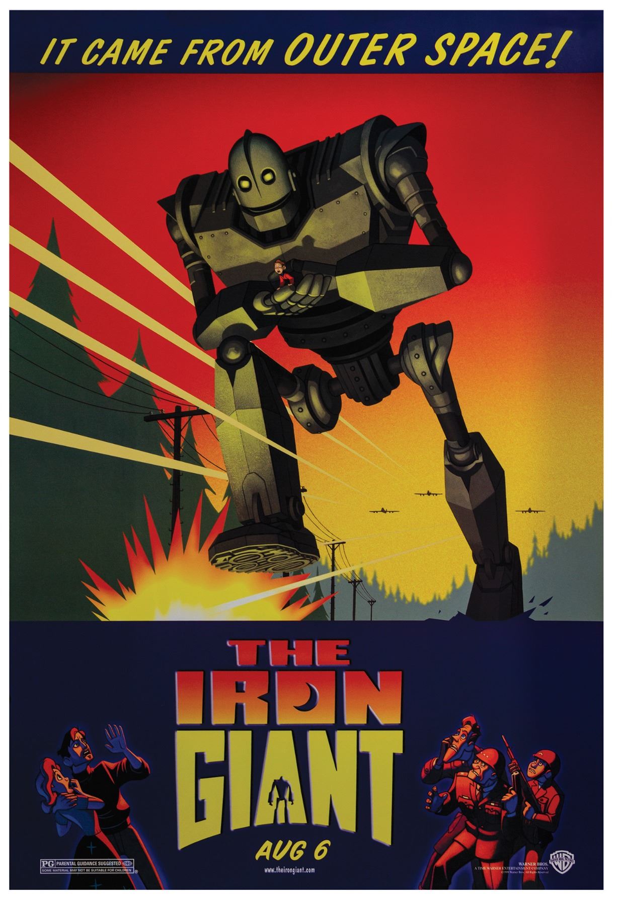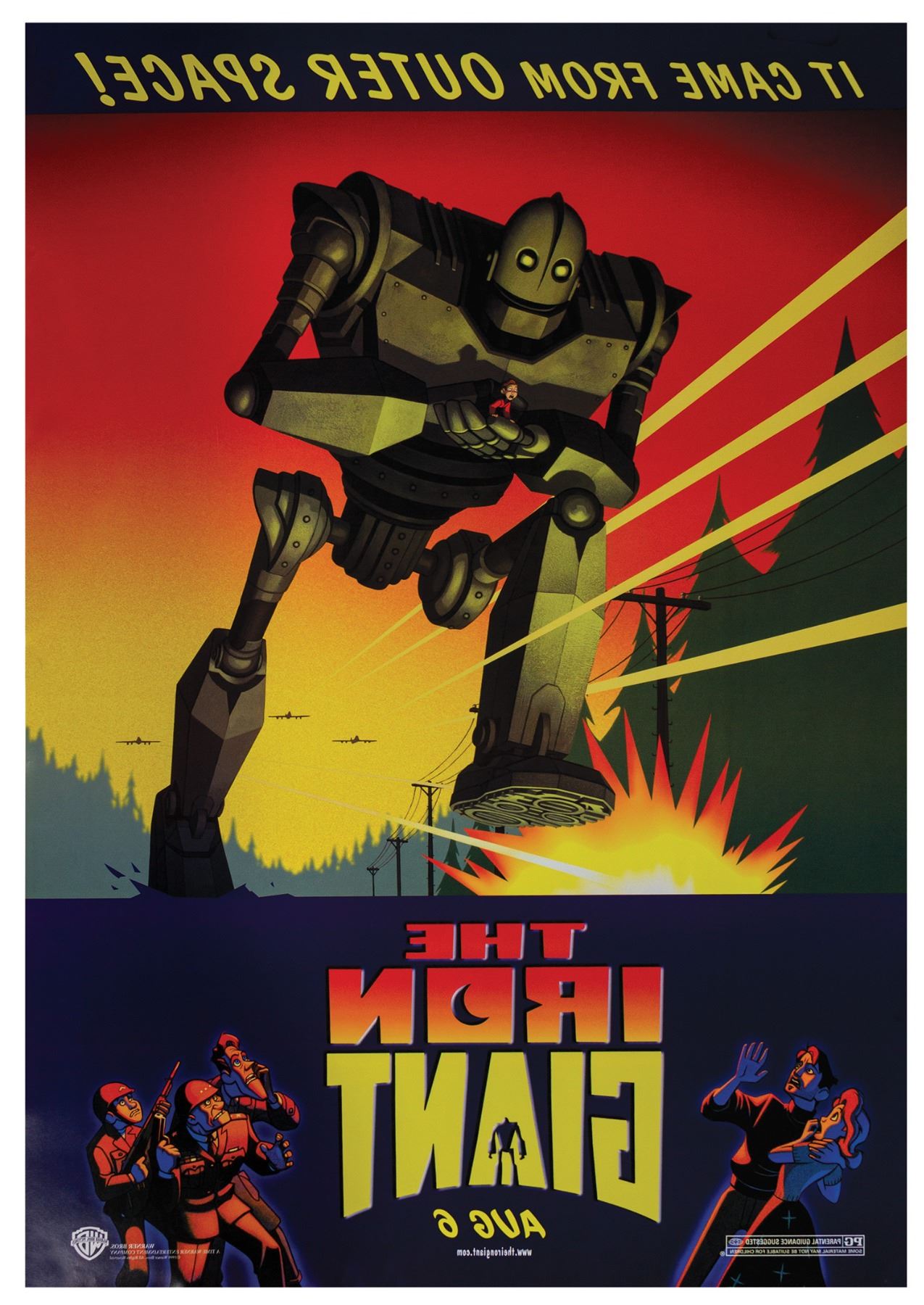 (Warner Bros., 1999) A popular one sheet poster for the animated feature film, The Iron Giant. Featuring fantastic science fiction imagery reminiscent of the classic Robby the Robot film posters, this poster measures approximately 41"x27" and is in good condition with minor edge-wear.