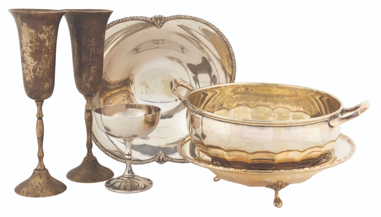 (Disney, 2003) A collection of six Isla de Muerta treasure props from "Pirates of the Caribbean: The Curse of the Black Pearl.” Included are two champagne flutes, a coupe champagne cup, a cocktail glass, and three bowls. One of the champagne flutes is seen on-screen during Captain Barbossa’s death scene. Ranging in size from 3.25” in diameter and 4.25” tall to 2.75” in diameter and 9” tall, the props display in good to very good condition with intentional distress, oxidation, and typical wear from production use.