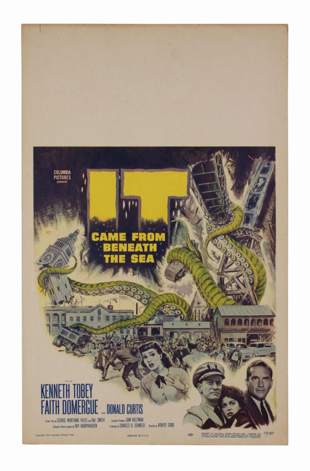 (Columbia, 1955) An original U.S. window card poster for It Came from Beneath the Sea. Measuring 22"x14", the piece is in very good condition with unobtrusive horizontal creasing at center, "15" written faintly in pencil at top right, and spots of discoloration.
