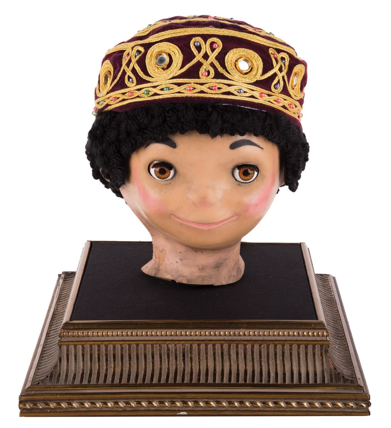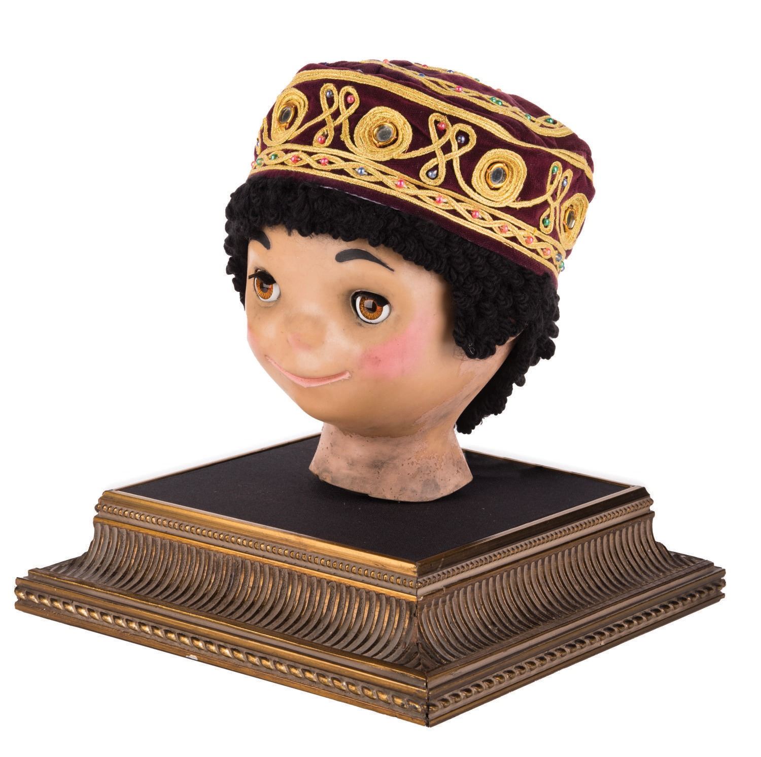 (Disneyland, 1966-80s) An Audio-Animatronic Doll Head from it's a small world in Fantasyland at Disneyland. The doll figure head was initially designed by Legendary Walt Disney Imagineers Marc Davis and Mary Blair, for installment in a show scene at Disneyland. This charming figural component includes its plastic "armature" shell, silicone rubber skin with zipper for removal, wig, and hat costume piece. The rear of the head notably retains its location identification impression reading "7-93 SW C", while the hat retains annotation reading "WDI Small World; FA14." The entire piece was created for a specific scene along the "Seven Seaways," was removed during a repair or scheduled rehabilitation of the attraction and has been mounted atop a fanciful 11.25"x11.25" and 3" tall display. The head measures approximately 8" tall and 8.5" in diameter and is in very good condition with expected wear from Park-use, handling, and age.