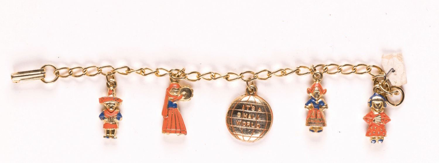 (Disneyland, 1960s) A souvenir "Little Miss" gold finish charm bracelet from Disneyland. This bracelet features 5 painted charms with four of them representing some of the countries from the attraction, and a globe reading "It's a Small World" in the center. The bracelet measures 6.5" and is in very good condition with minor tarnish from age and some paint loss to the charms throughout.