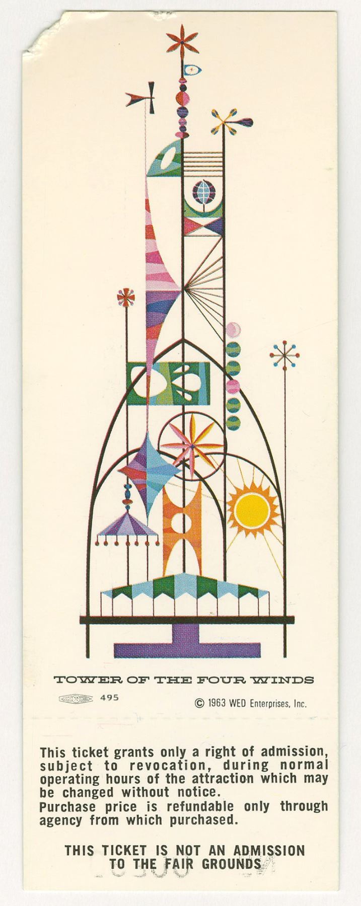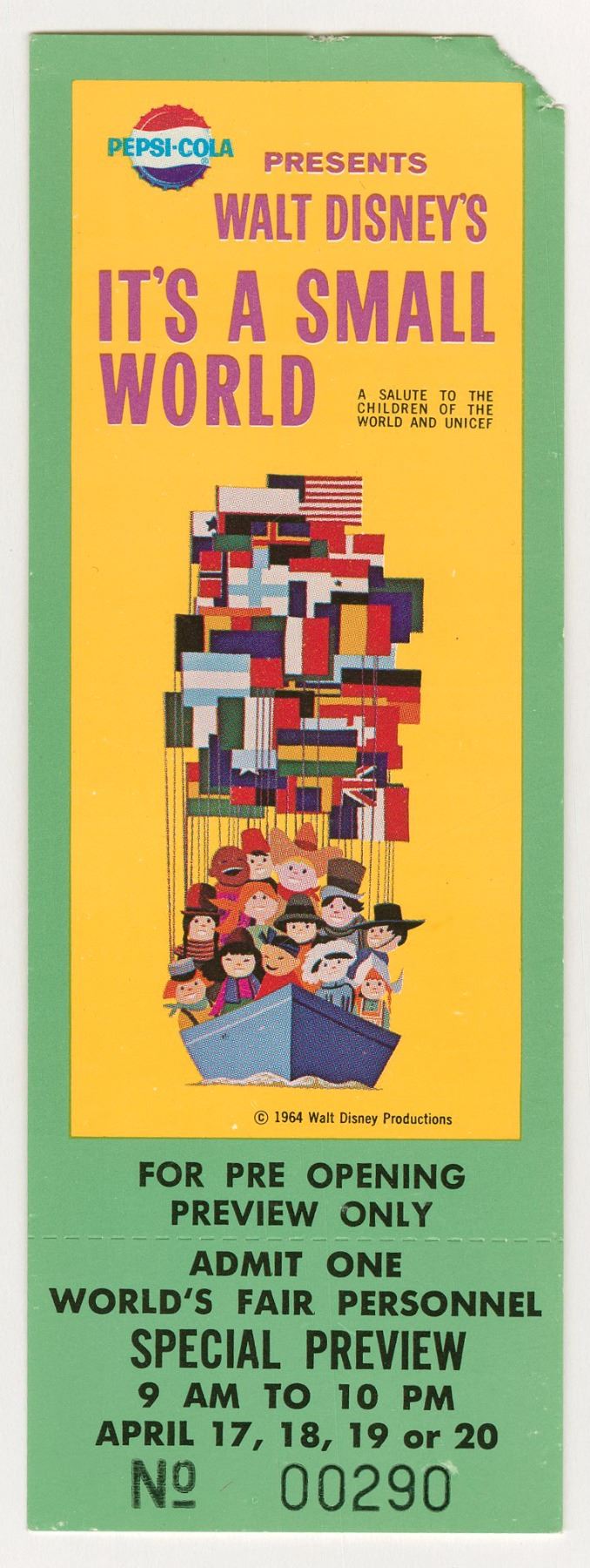 (World's Fair, 1964) A very rare pre-opening ticket from the It's a Small World exhibit at the 1964 New York World's Fair. The ticket was offered exclusively to Disneyland Ambassadors and World's Fair Personnel, and provided access to a special pre-opening preview of Pepsi-Cola and Walt Disney's UNICEF show on April 17-20. Featuring a green border rather than the blue seen on standard guest tickets, the front depicts the children of the world embarking on "the happiest cruise to ever set sail." Measuring 5.5" x 2", the ticket is in good condition with a torn top right corner, discoloration from age, and minimal edge and corner wear.