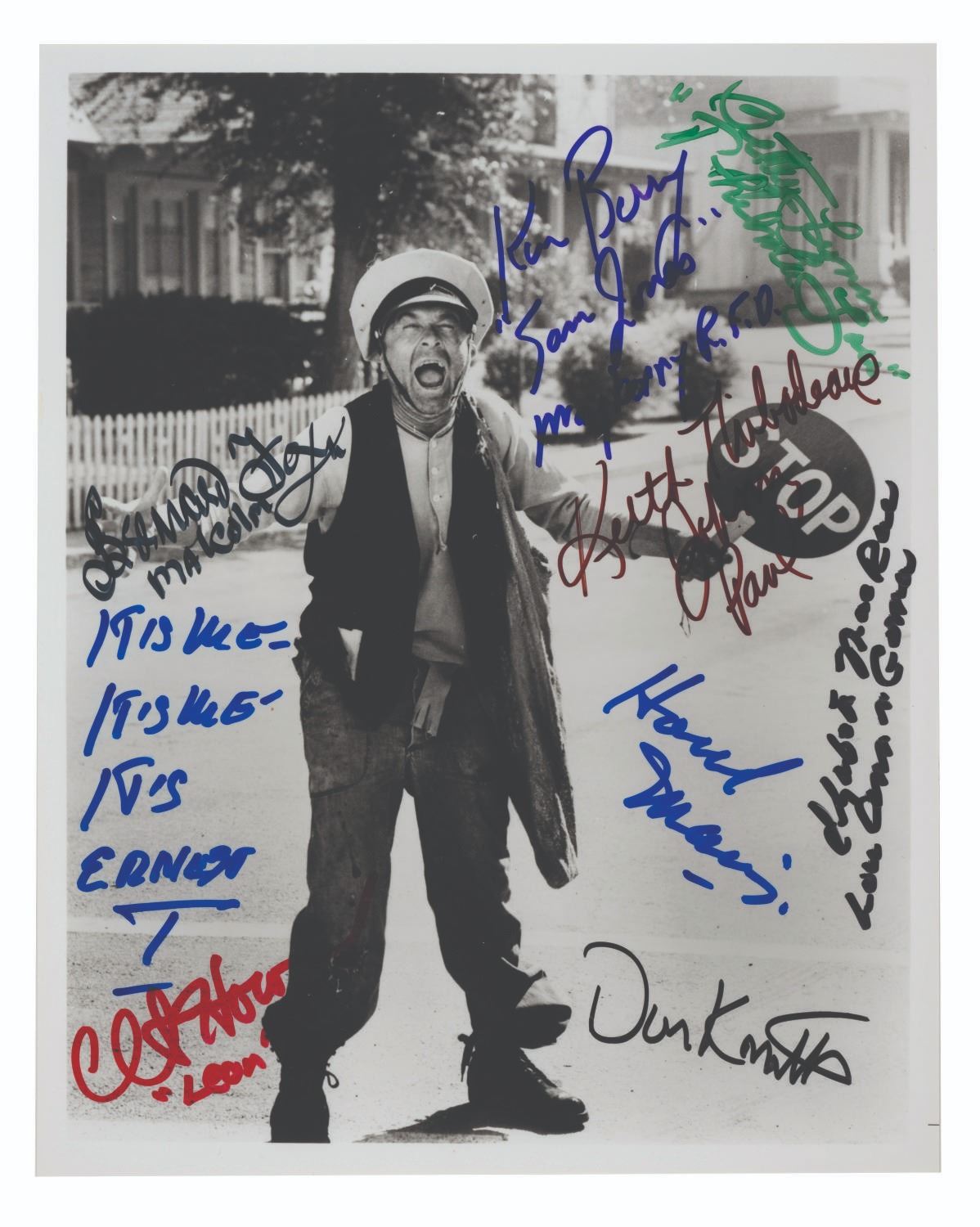 (CBS, 1980s-90s) A publicity photo of Ernest T. Bass from “The Andy Griffith Show” signed by eight cast members. The photo is signed by Howard Morris (Ernest T.), Don Knotts (Barney Fife), Bernard Fox (Malcolm Merriweather), Clint Howard (Leon), Keith Thibodeaux (Johnny Paul Jason), Elizabeth MacRae (Betty Parker), Ken Berry (Sam Jones), and Betty Lynn (Thelma). Measuring 8” x 10”, the signed photo is in fine condition.