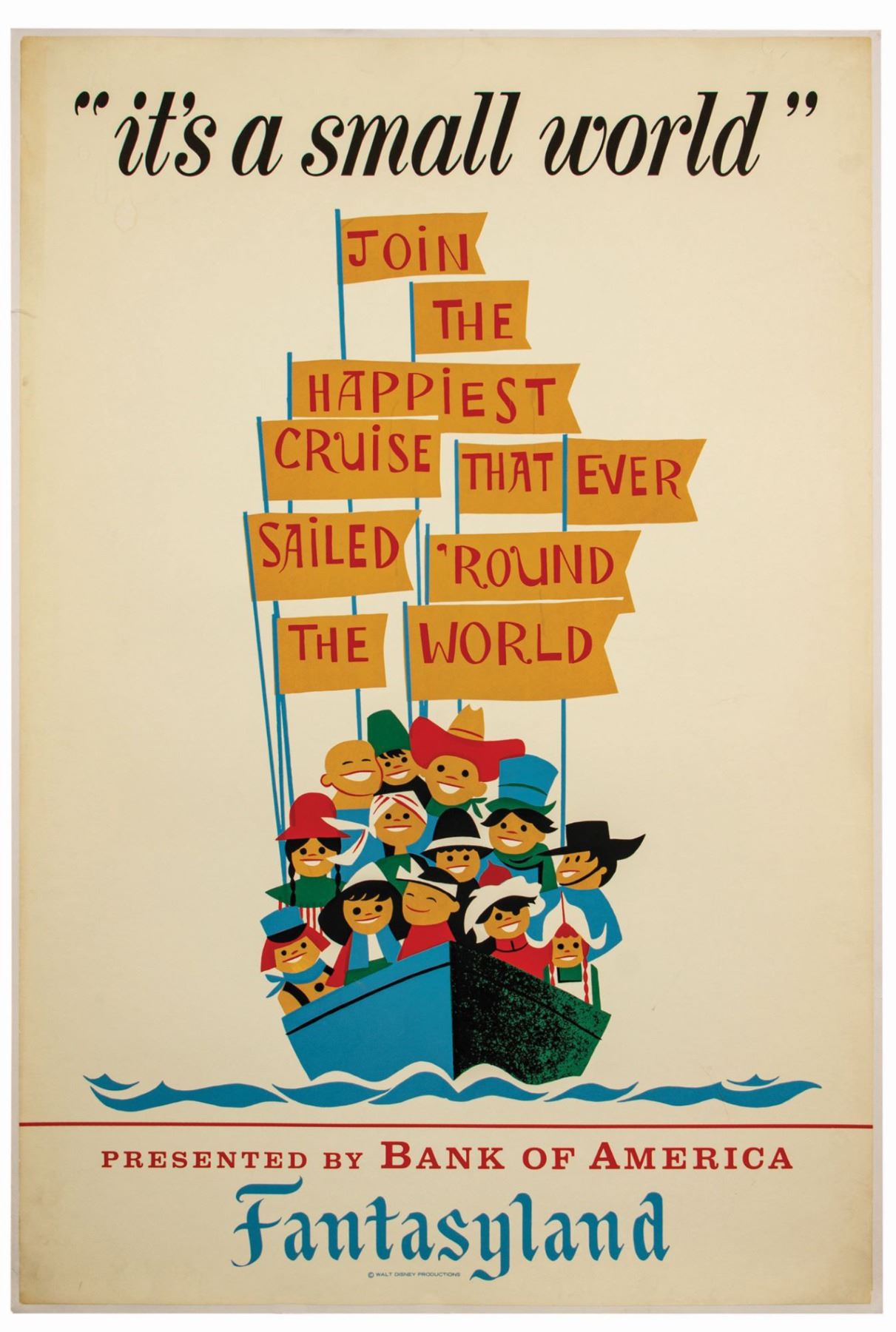 (Disneyland, 1966) A hand-silkscreened attraction poster for It's a Small World. Designed by Paul Hartley, this poster features the children of the world on the innovative and hugely successful boat-ride aspect of the attraction. This poster measures 54"x36" and is in fair condition, with heavy edge-wear in the form of multiple small tears, as well as a 1.5" tear at the top. There are several spots of moisture discoloration at the other left, some scuffs and scratches throughout, and discoloration down the left side. There are a few lines of color through the center text which are believed to be from the original printing process. The poster has been linen-backed for its preservation, adding approximately 1" of linen to both measurements.
