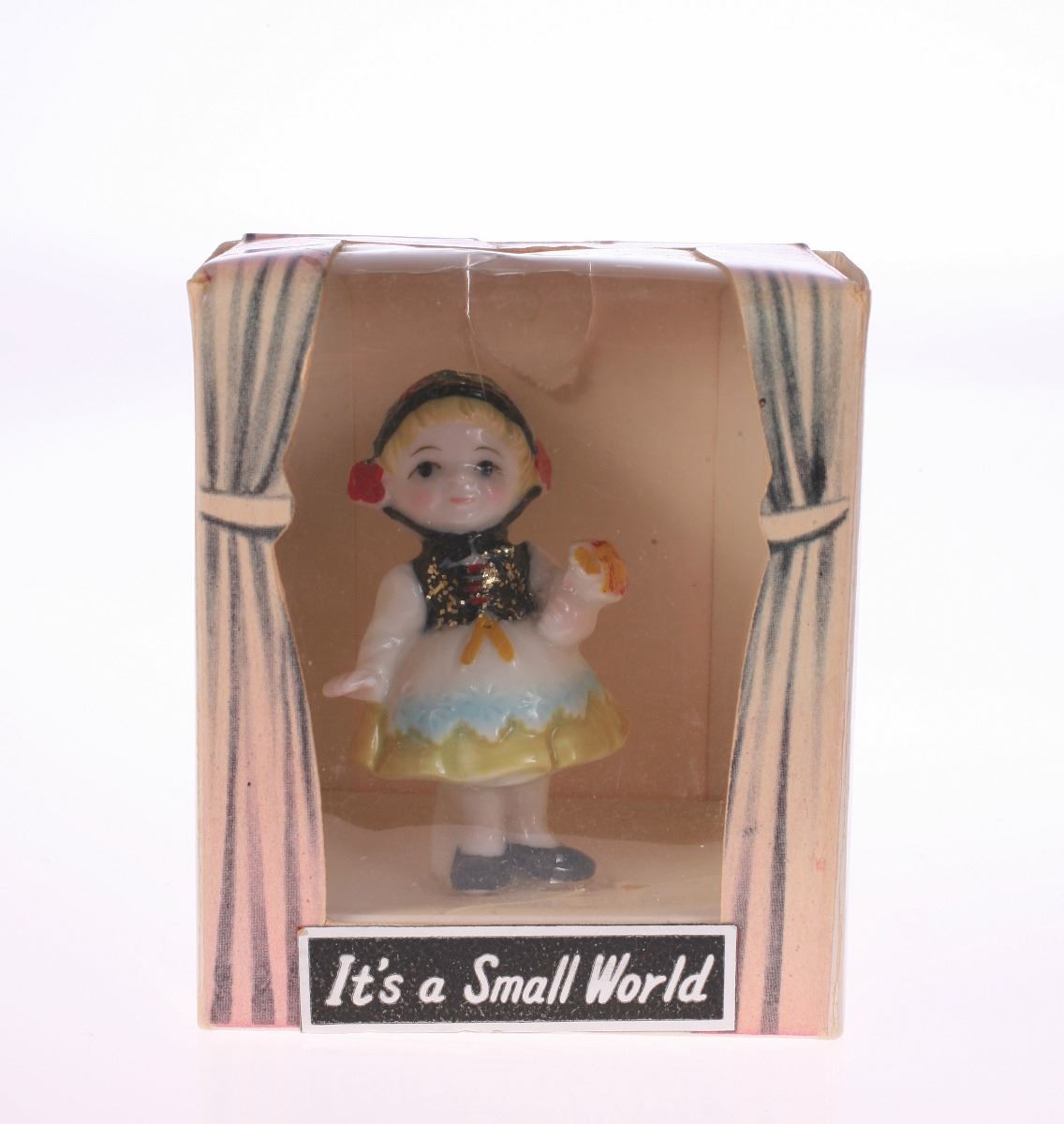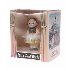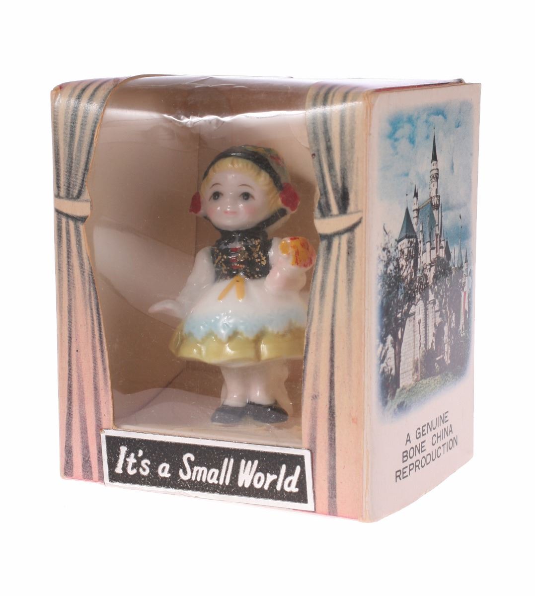 (Disneyland, 1964) Charming miniature "genuine bone china reproduction" of an "It's a Small World" character. Figurine comes in its original box. Box measures 3"x2.5"x2". In good condition with minimal wear to the box.