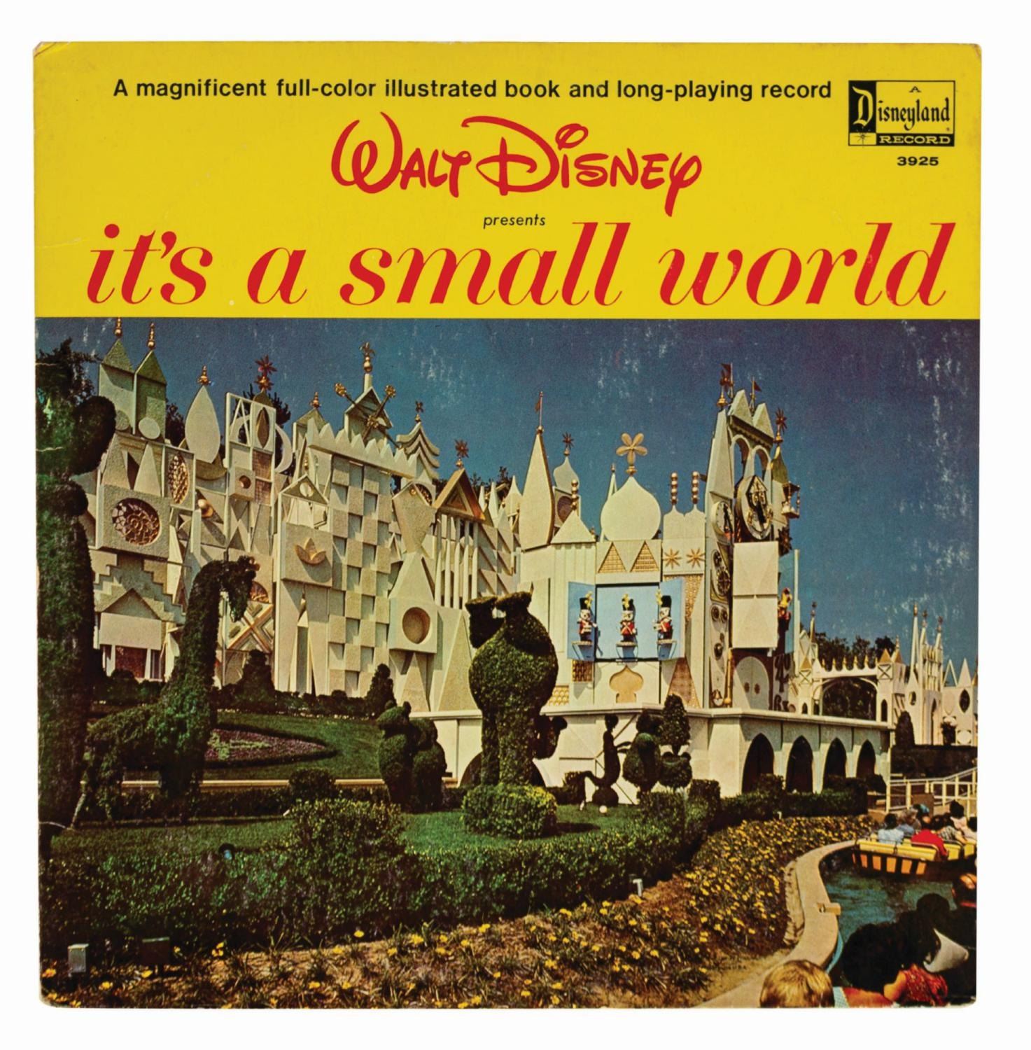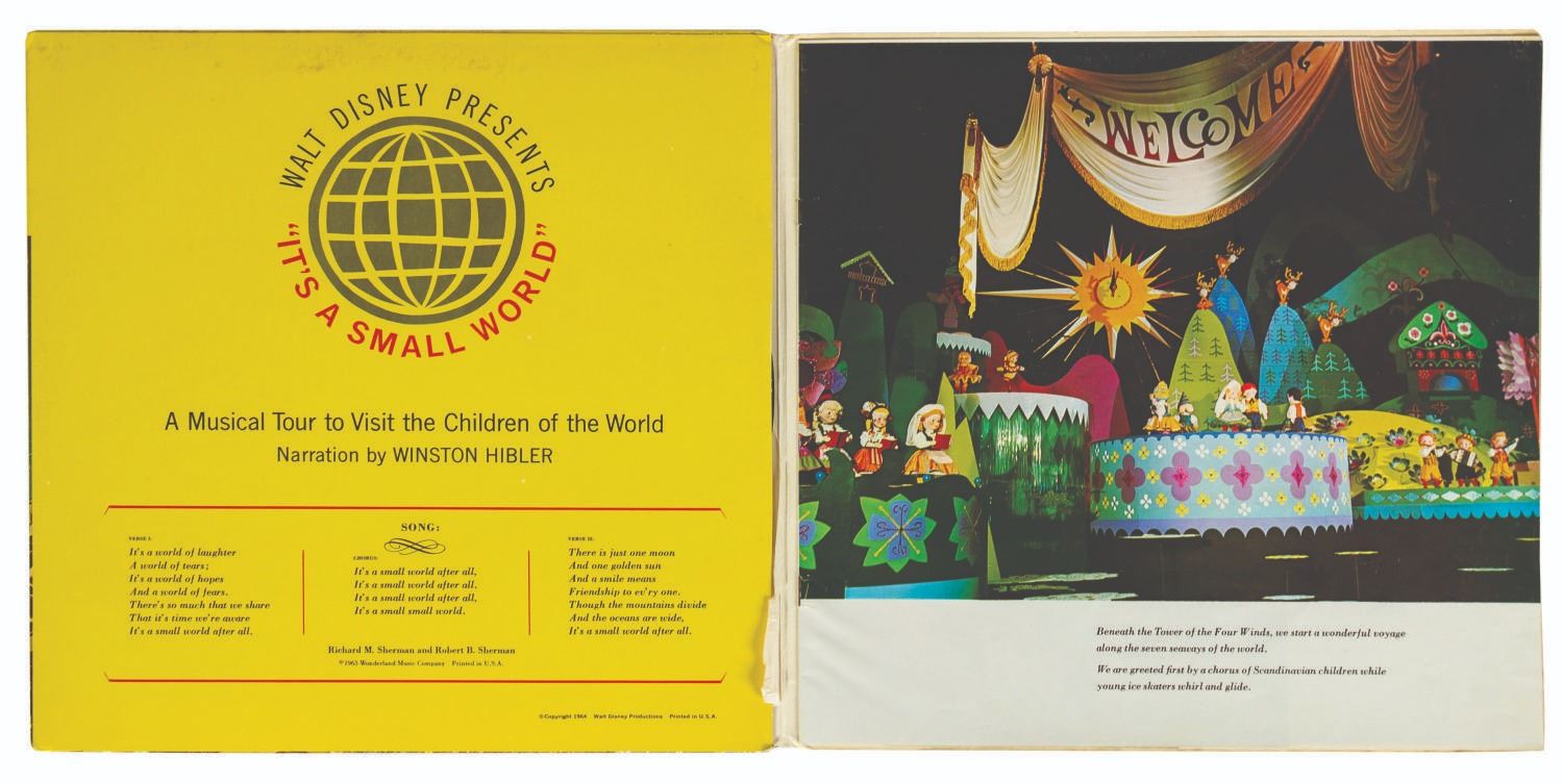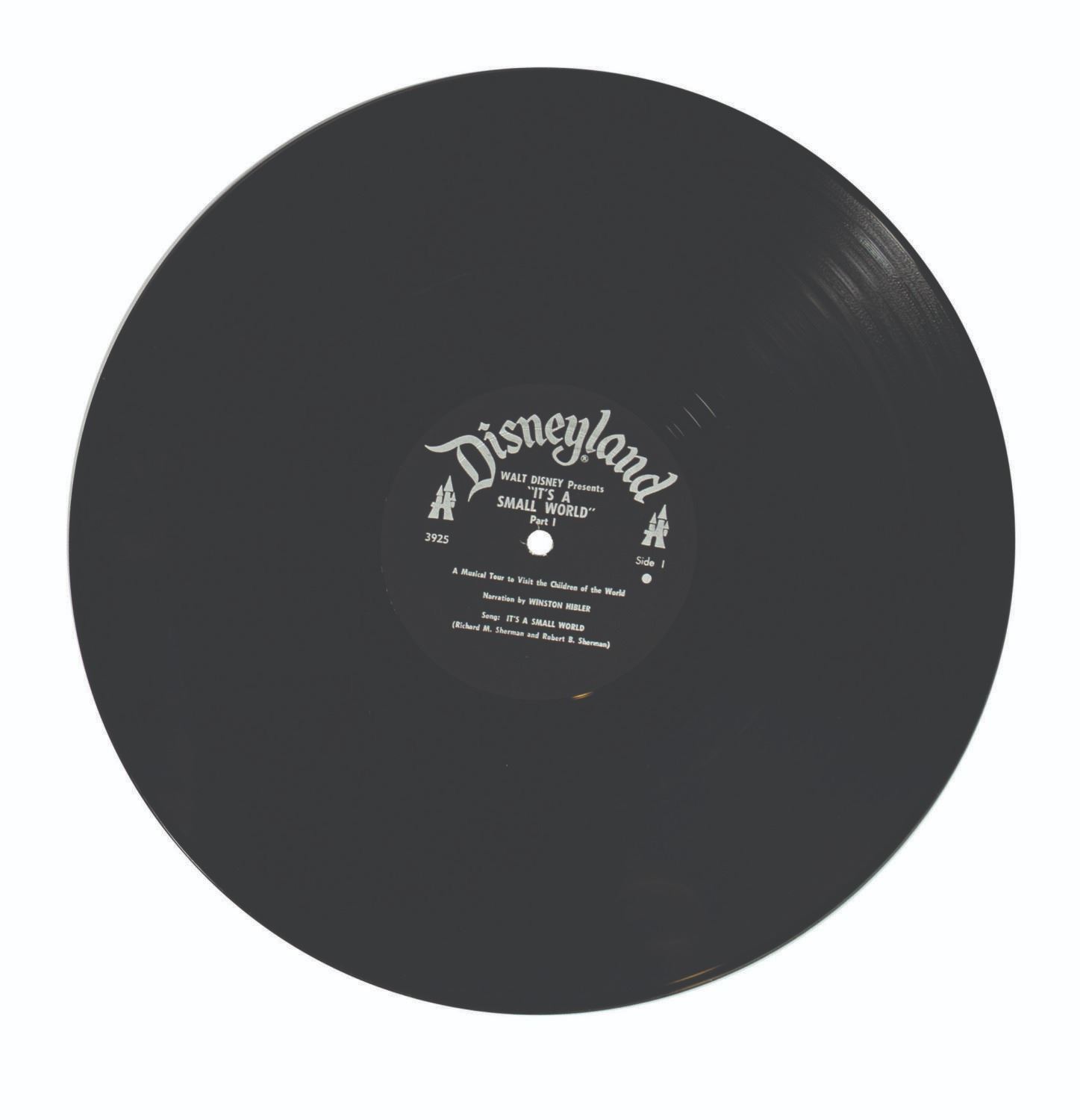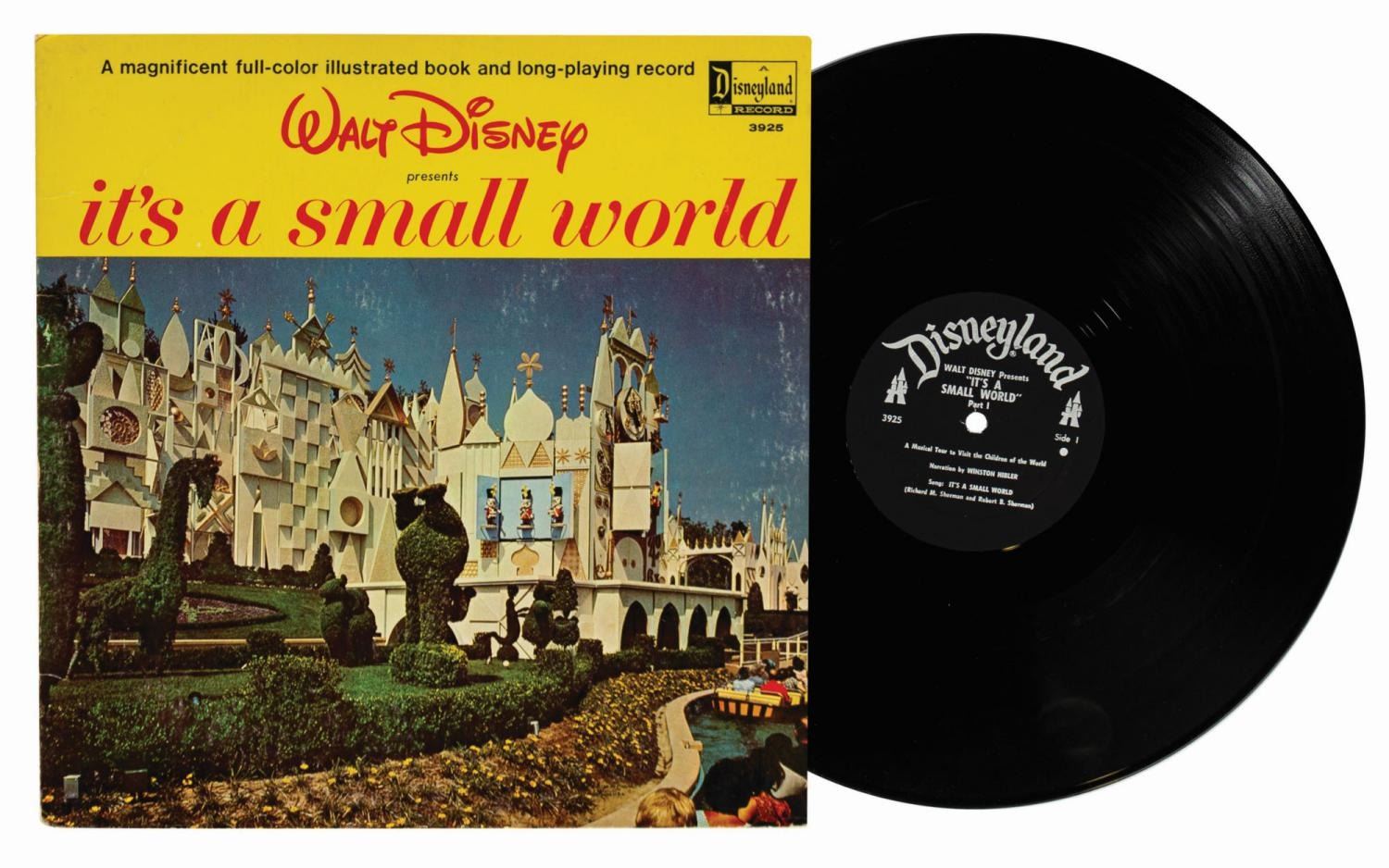 (Disneyland, 1964) A vintage Walt Disney Presents It's a Small World long-playing vinyl record. Both sides of the album feature "A Musical Tour to Visit the Children of the World" narrated by Winston Hibler with the Sherman Brothers' famous theme song from the ride. The record is in the original sleeve which opens to a reveal an 11-page full color book offering a walkthrough of the attraction. Measuring 12" in diameter, the record is in very good condition with minor scratches and scuffs. The sleeve measures 12.5"x12.5" and is in good condition with some spidering to the spine, edge wear, a circular record impression on the front cover, and discoloration and spotting to the back cover.