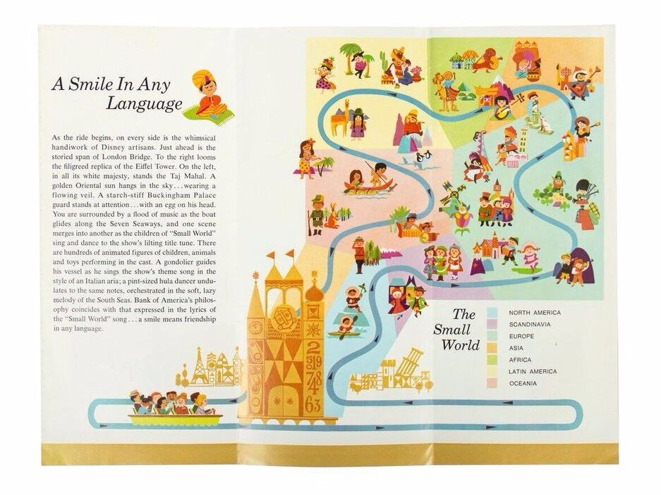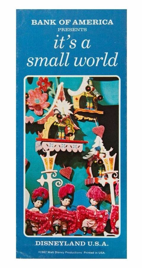 (Disneyland, 1967) A rare brochure promoting the "It's a Small World" attraction at Disneyland, presented by Bank of America. This brochure discusses what went into the creation of the attraction and the "space-age animation" utilized to achieve the presentation. This item measures 8.5"x3.75" and is in very good condition.