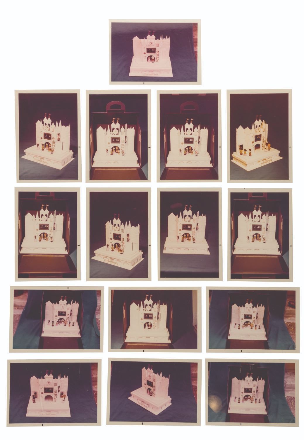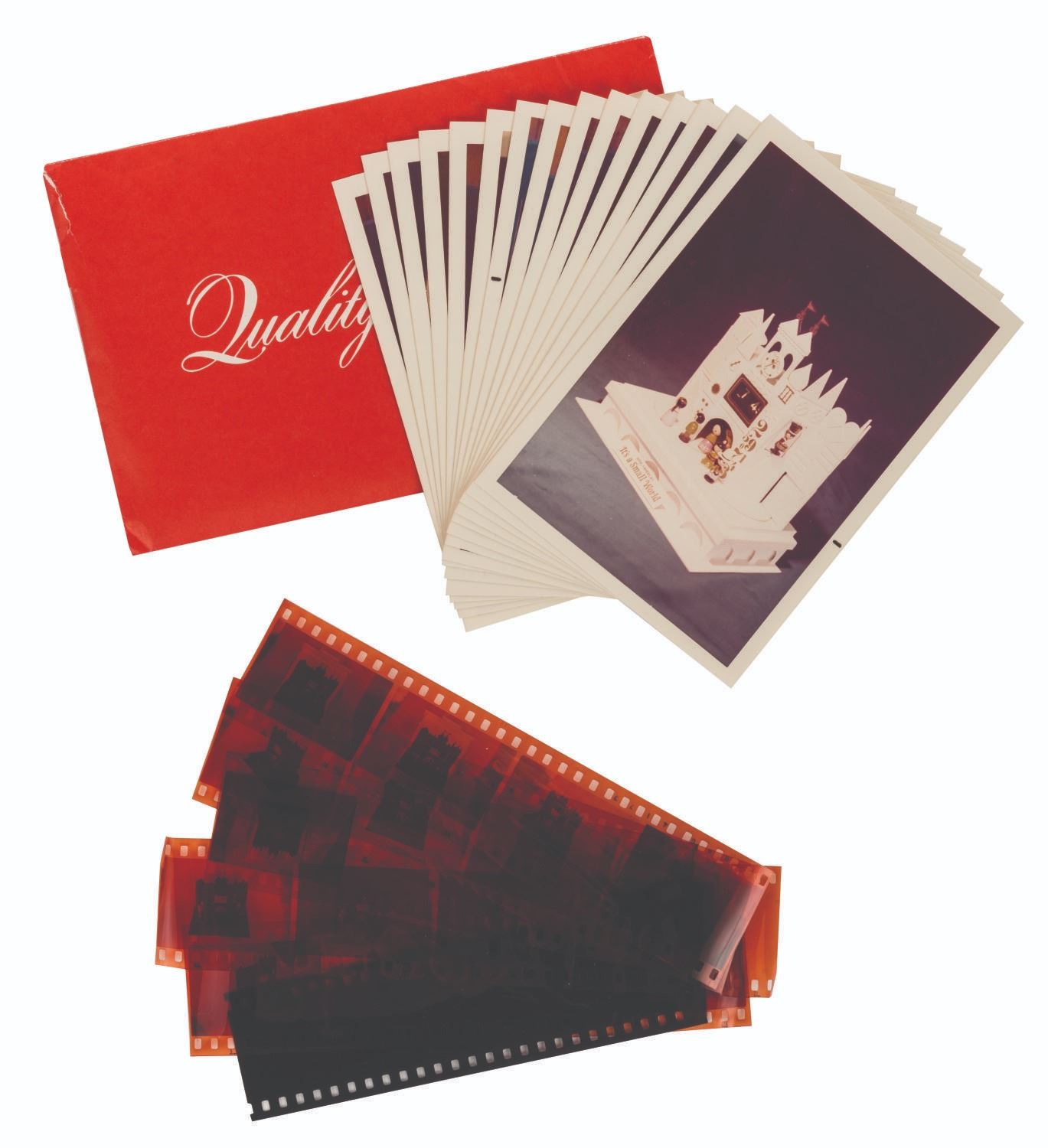 (Disneyland, 1980s) A collection of 15 photographs and 6 negative strips depicting the prototype of an It’s a Small World Clock souvenir. Ranging in size from a 1.5” x 5.25” film strip to the 3.5” x 5” photos, the items are in fair to good condition with heavy spotting on the photos, light scratches on the strips, and discoloration from age.