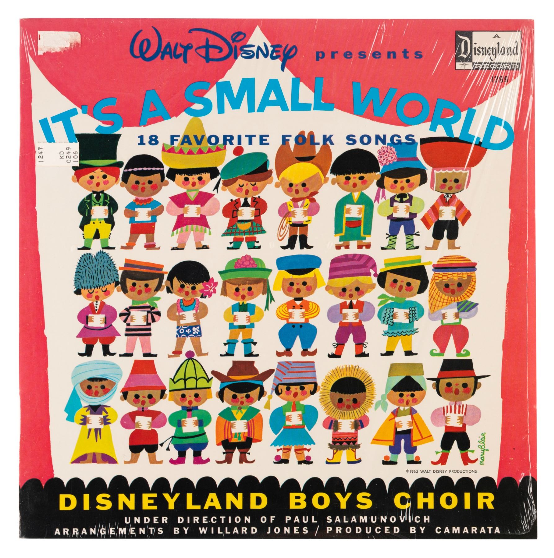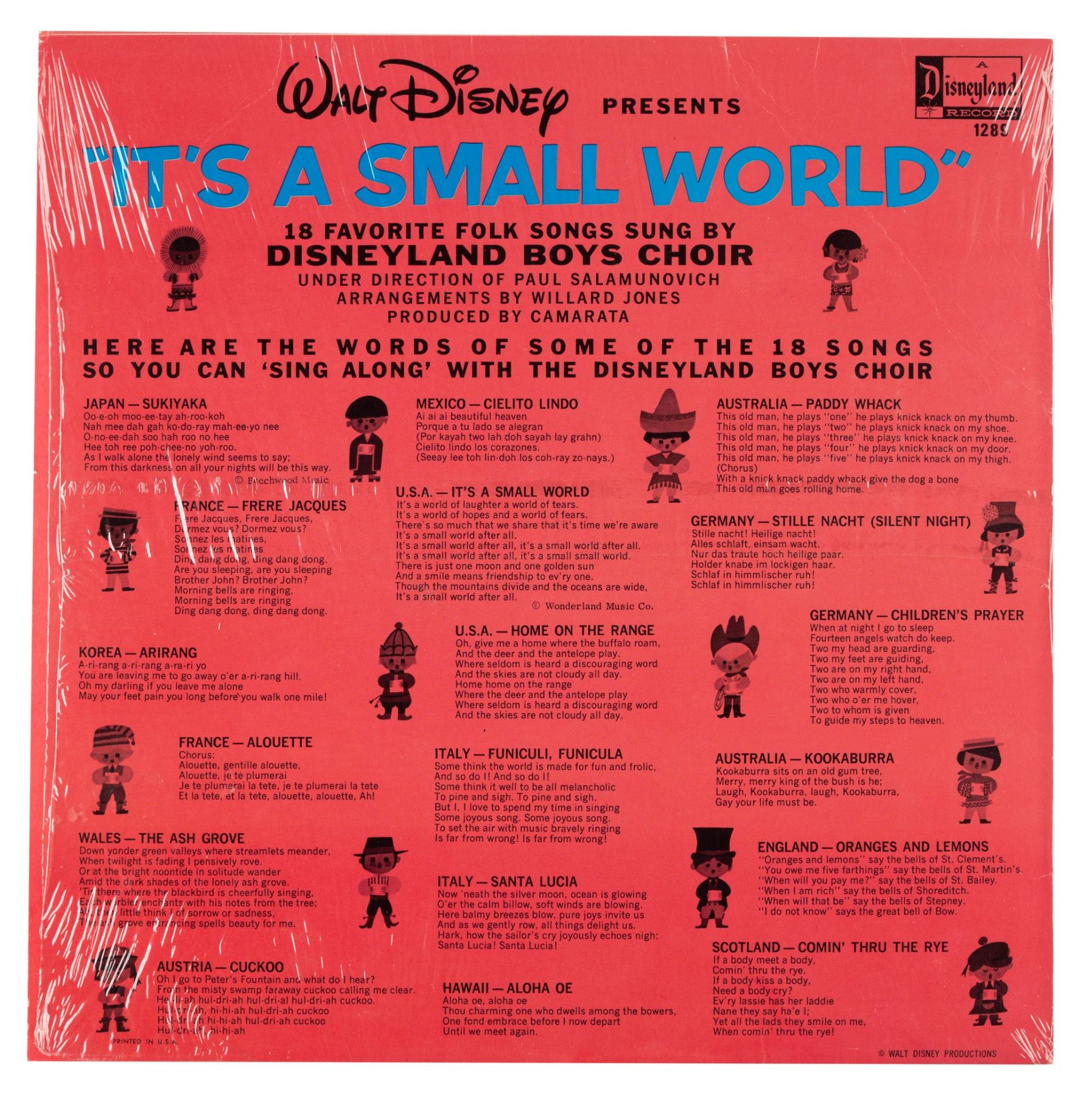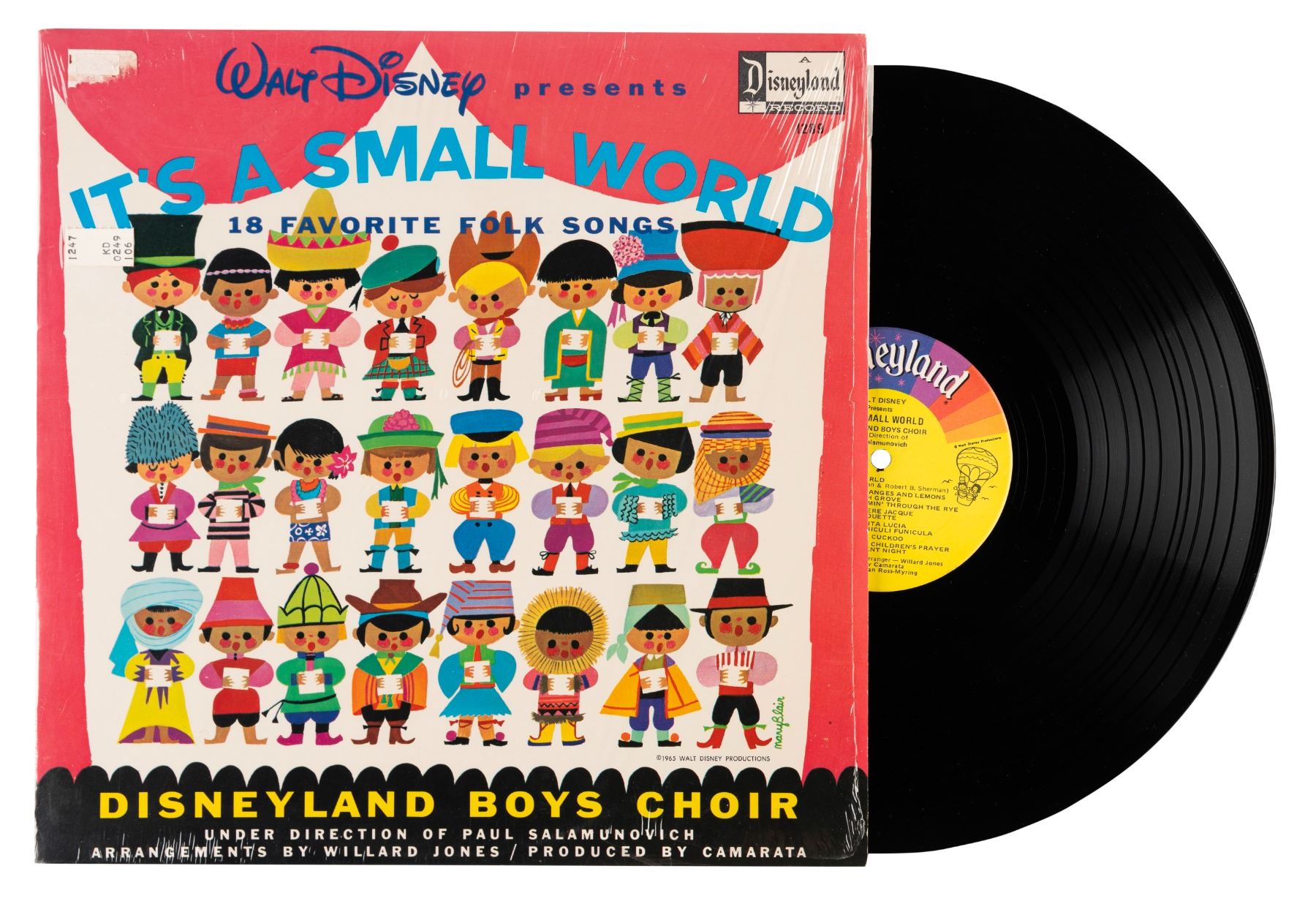 (Disneyland, 1965) A 33 RPM record and sleeve for It's a Small World, as sung by the Disneyland Boys Choir. The record includes a track list with songs representing 13 countries. The 12.25" x 12.5" sleeve is in good condition with light wear from age and handling, and the 12" record is in fine condition.