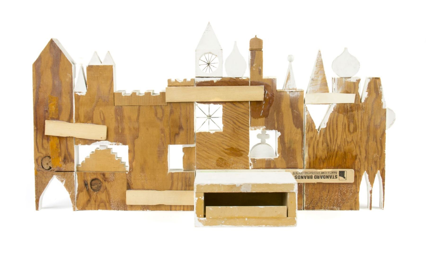 (Disneyland, 1965) An incredible set of five model sections created by Rolly Crump for the facade of Disneyland's "It's a Small Worldâ€. Rolly created these models in painted wood based on Mary Blair’s concept drawings. When Rolly presented these models to Mary to aid her in designing of the façade, the models were still composed of five separate interchangeable sections. Mary Blair incorporated the sections throughout her larger model before she presented the final version to Walt Disney. The patterns and shapes of these models can be seen in the final façade. After the larger model was no longer needed, Rolly rescued his panels and reassembled the sections into their current configuration for his personal display. This model measures approximately 13.5" tall, 27" long, and 6" deep. The condition is good with some expected wear throughout from use. Rolly adhered paint stirrers to the back-side of the model sections to hold them in place, and a wooden block is attached to the back for support. This model represents a significant milestone in the design of the "Small World" façade. These sections were used by both Rolly and Mary in the creation of the iconic Disneyland attraction, and were personally handled and approved by Walt Disney.