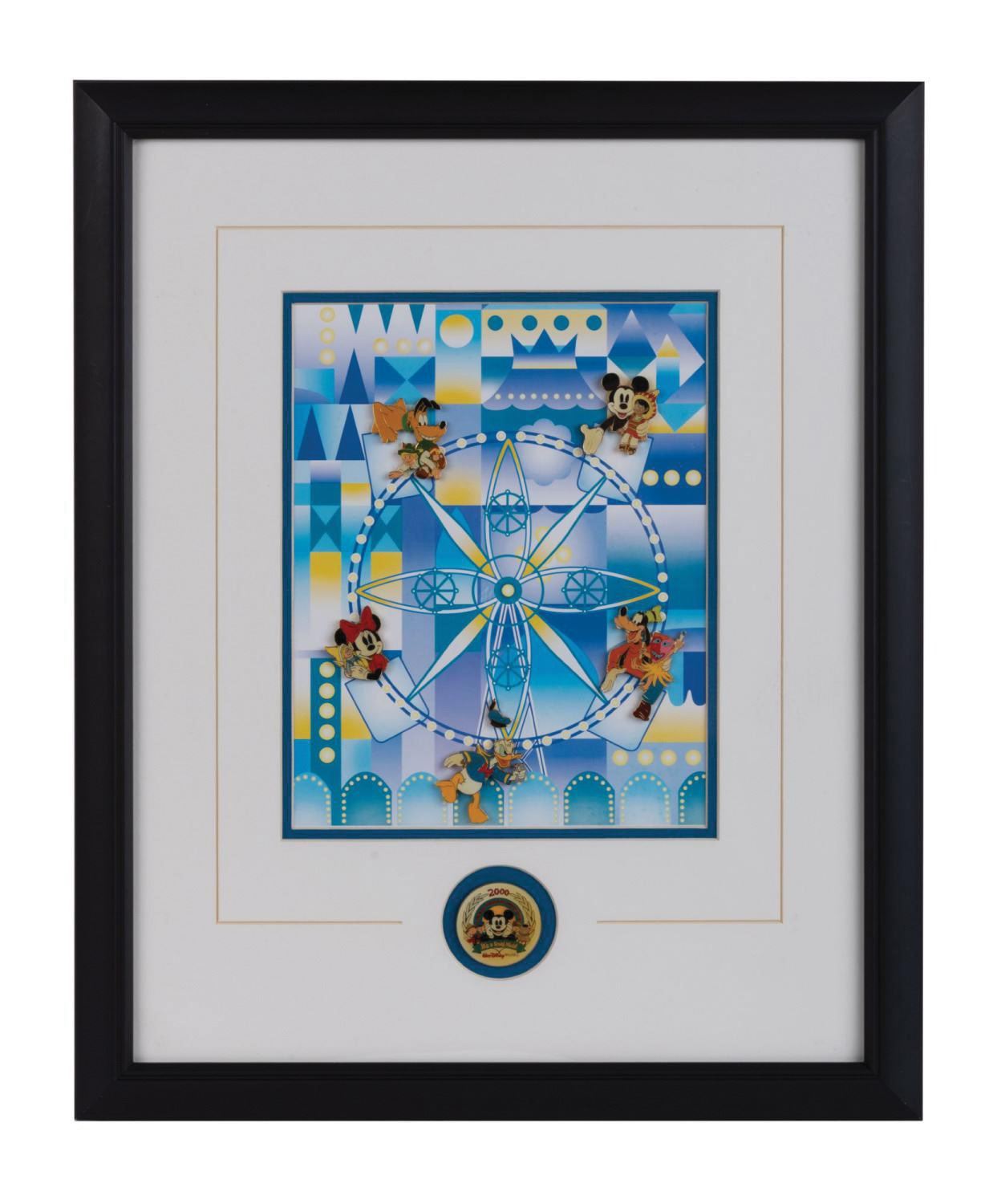 (Walt Disney World, 2000) A framed 7-pin limited edition set created exclusively for the Disneyana Convention at Walt Disney World in 2000. The framed display depicts the "Fab Five" and Children of the World taking a spin on the big Ferris wheel, as seen along the canals of It's a Small World. The pin set displays in very fine condition within a 15"x18.75" frame. The original COA is included.