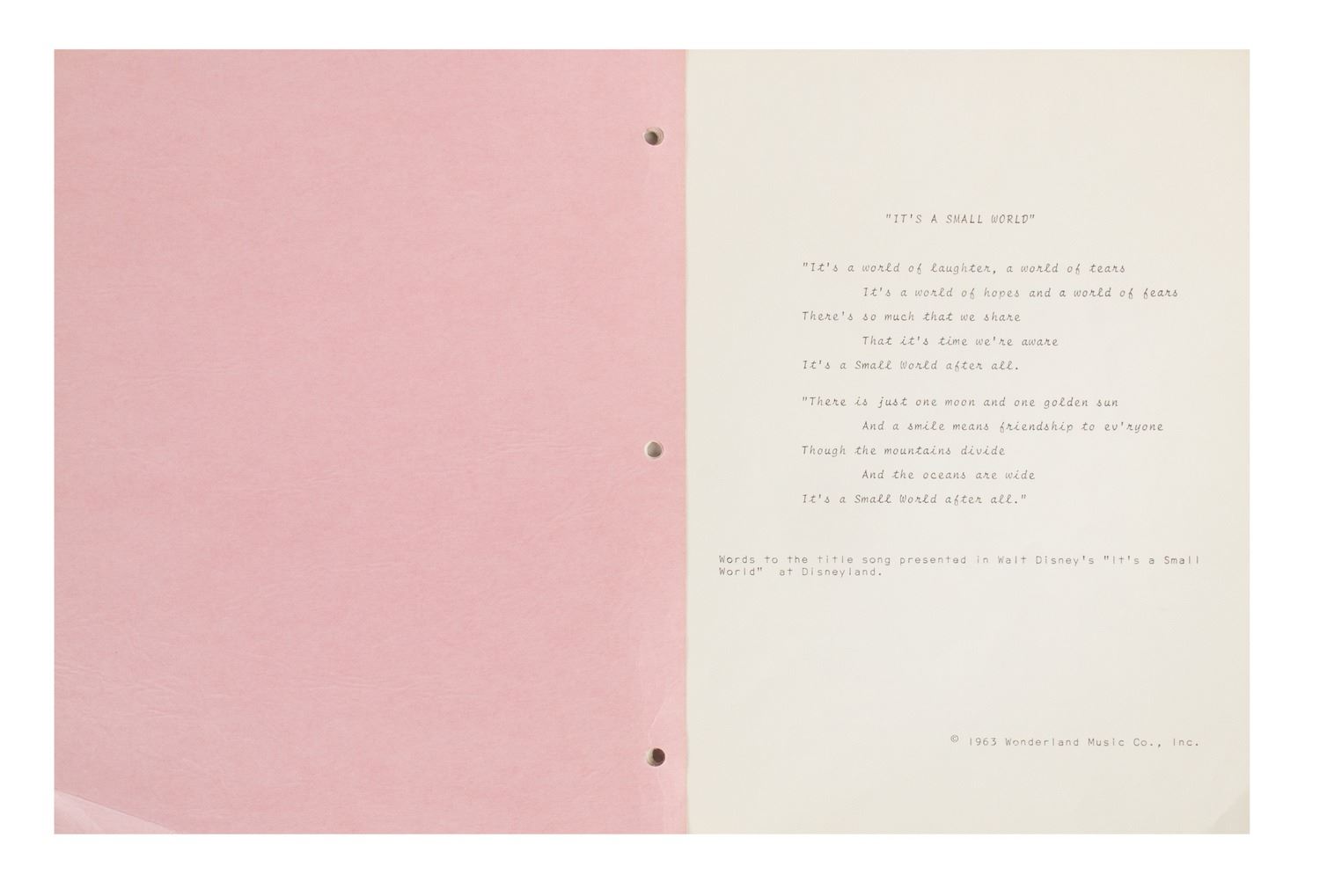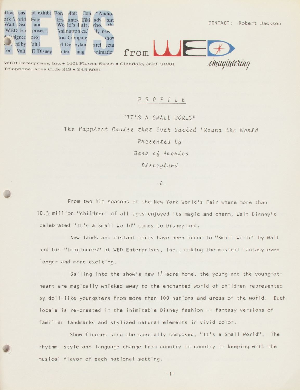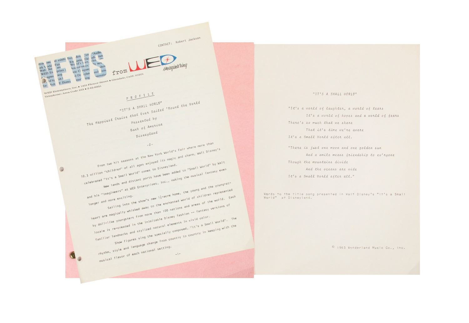 (Disneyland, c.1966) A packet prepared by WED Imagineering titled "Profile - It's a Small World". This packet was created to provide information on the new Disneyland attraction, and includes descriptions of the different scenes of countries, the Small World clock, and various facts and figures. This 12-page packet measures 11"x8.5" and is in very good condition with minor cover-wear from use.