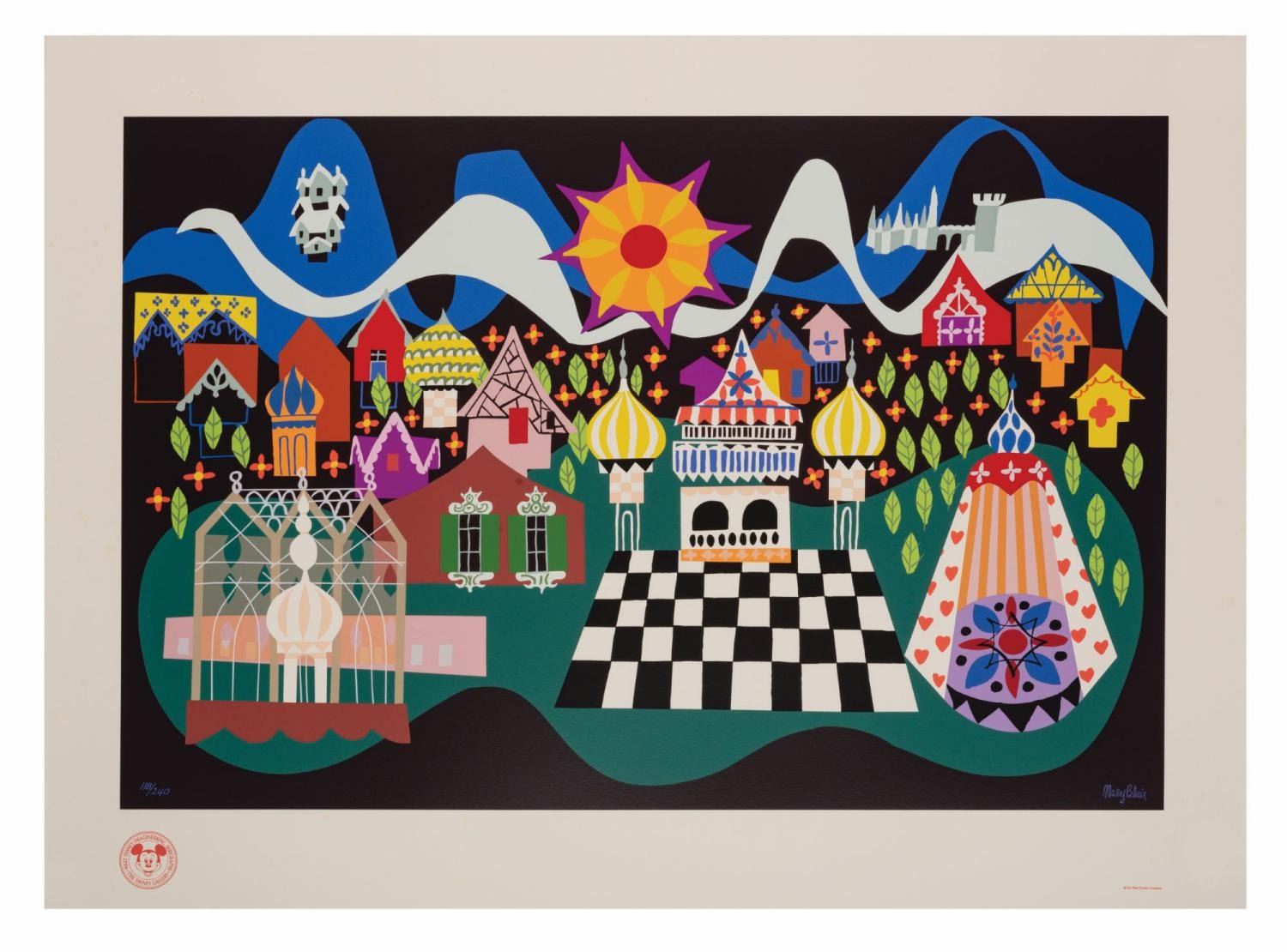 (Disneyland, c.2000s) A high quality serigraph print of Mary Blair's concept artwork for It's a Small World. Created as part of the Walt Disney Imagineering Serigraphs collection at the Disney Gallery, this print features Blair's facsimile signature in the lower-right and is numbered 118/240 at the lower-left. It measures 25.5"x35 and is in very fine condition.