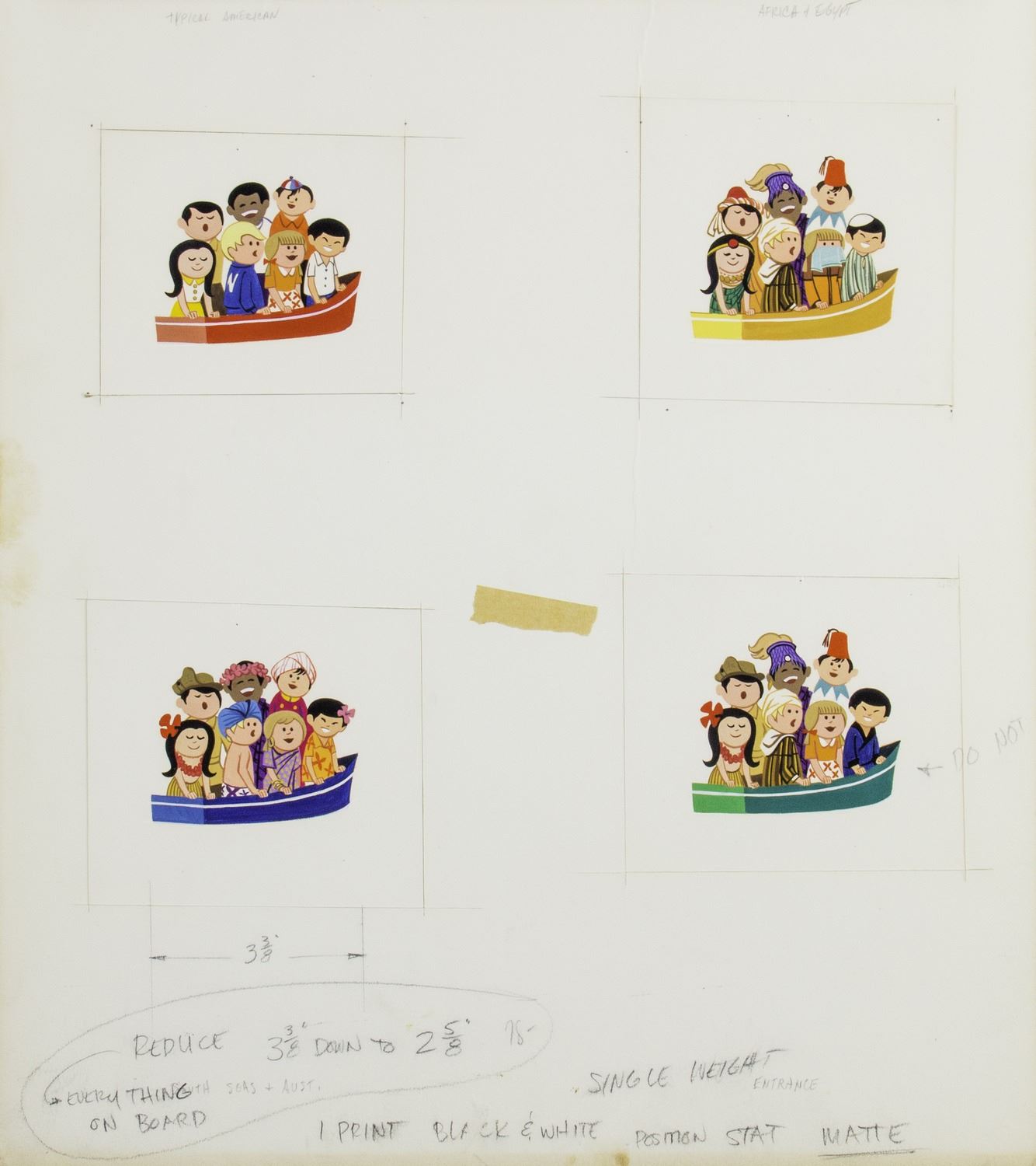 (Disneyland, 1978) A set of (4) original paintings on an artist's board, created for Disneyland's souvenir guidebook titled "It's a Small World - A Disneyland Pictorial Souvenir". The artwork features (4) images of different children of the world which were used throughout the guidebook. There are two protective paper sheets hinged over the top of the artwork, and there are numerous development notes written around the edges and on the back. The paintings are accomplished in acrylic on artist's board that measures 18"x16.5". The condition is very good with some minor wear throughout from use.