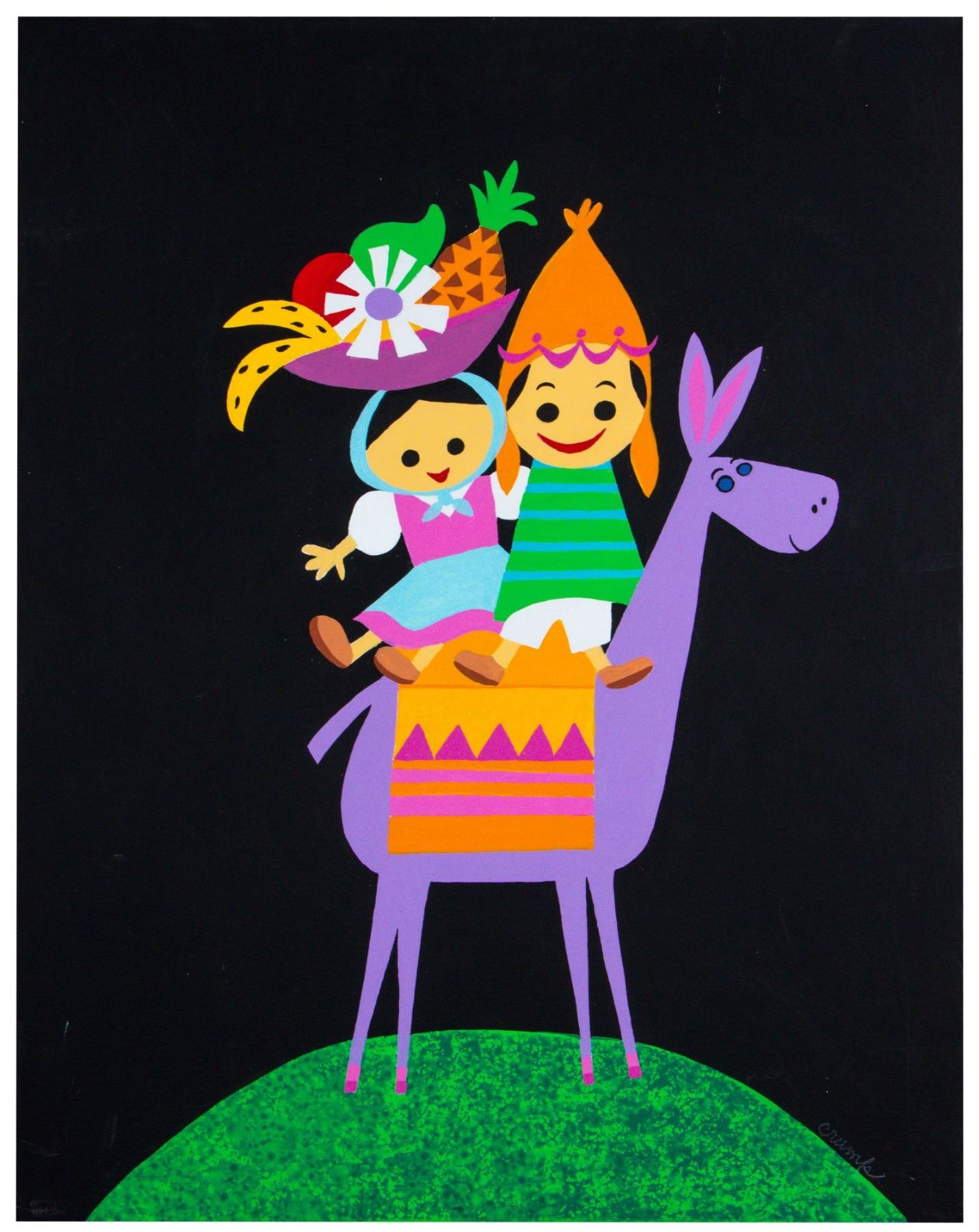 (c.2000) An original painting created by Rolly Crump featuring a scene inspired by Disney's "It's a Small World" attraction. The painting is accomplished in acrylic on canvas and measures 28"x22". The condition is very good with minor wear and the painting is signed by Crump in the lower-right corner.