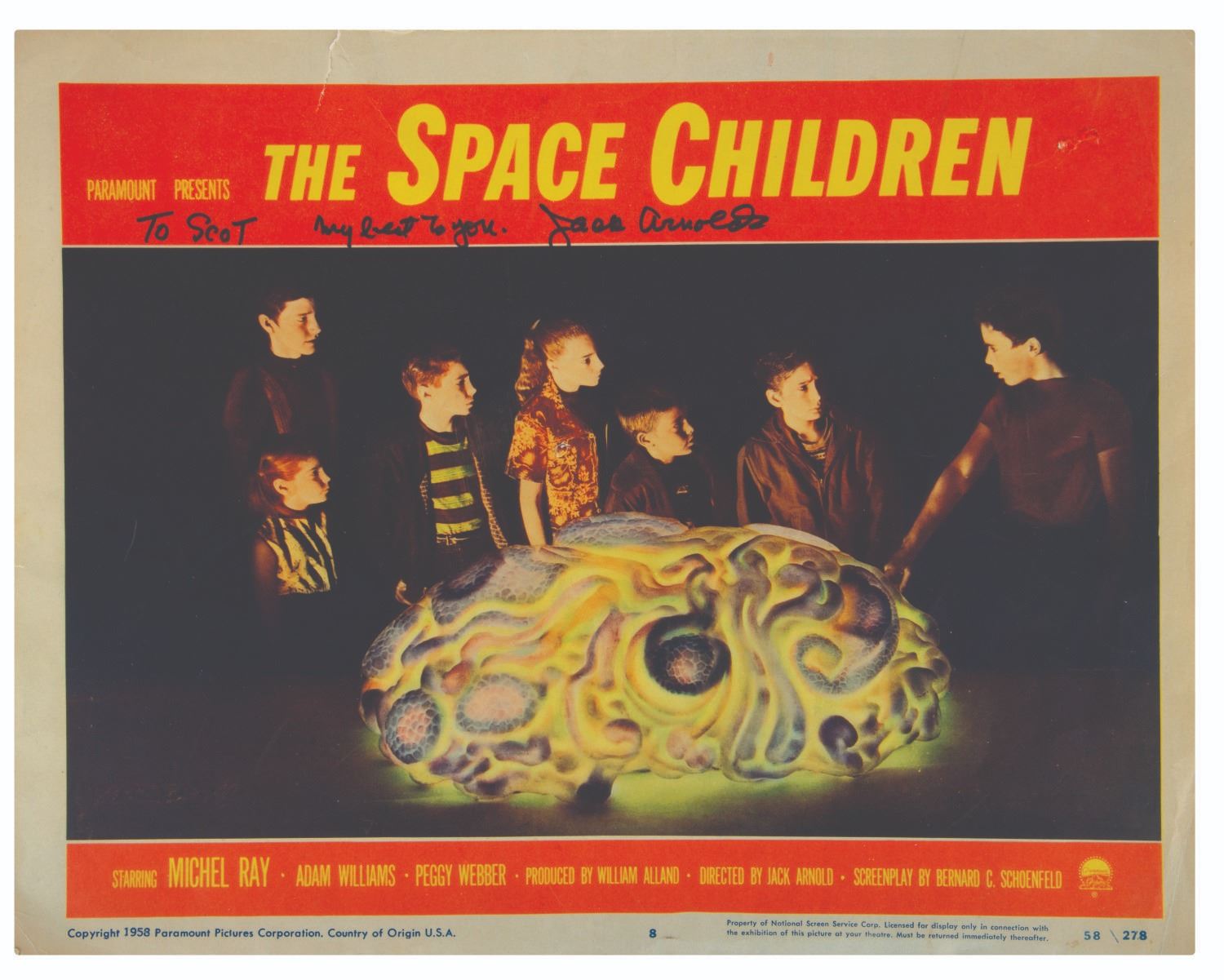 (Paramount Pictures, 1958) An original release lobby card from The Space Children, signed with dedication by director Jack Arnold. Measuring 11"x14", the card with autograph is in good condition, with color shift from age, a 1" tear and top edge, and a.5" scuff to the right of the title.
