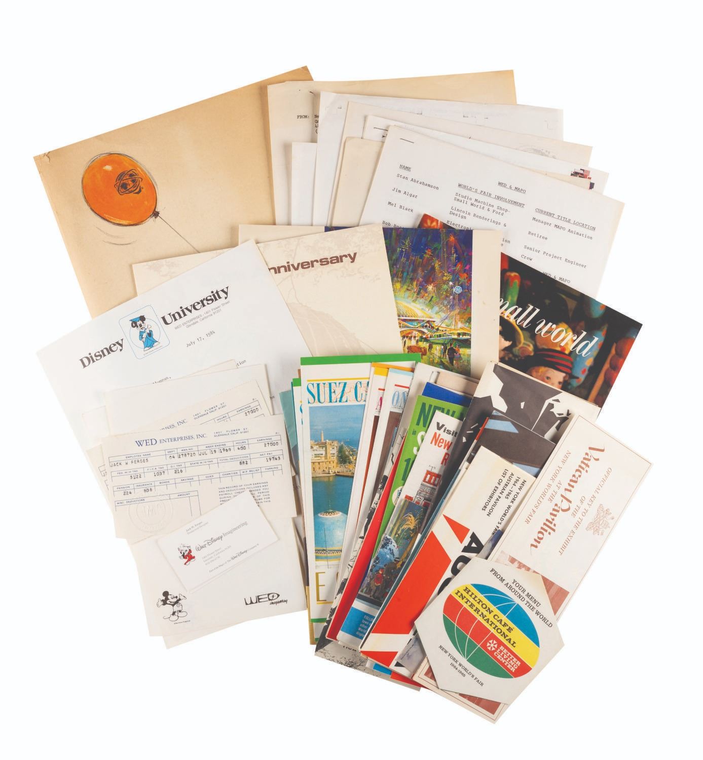 (World's Fair, 1964) A one-of-a-kind portfolio from Imagineer Jack Ferges' tour of the New York World's Fair, along with Disney staff in June of 1964. The portfolio includes a list of which World's Fair pavilions each Imagineer worked on, the group's itinerary, the Stadium View Inn room numbers for Walt Disney Imagineers, an "It's a Small World" souvenir guide, a "Progressland" guide, and over 30 various brochures, menus, and more. The pieces are accompanied by a 10.5"x13.5" "Walt Disney and World's Fair Official Portfolio Folder" and are in good condition with expected wear throughout.