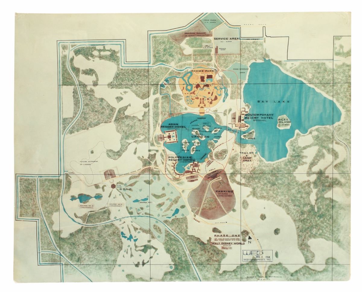 (Walt Disney World, 1968) Color presentation map mounted to illustration board of the proposed layout of WDW with revisions. This map hung in the WED office of Jack Sayers, later Vice President of Lessee Relations. Features a WED stamp dated Jul 1, 1968. Measures 15.5"x19.5". In good condition with some edge and corner wear from use.