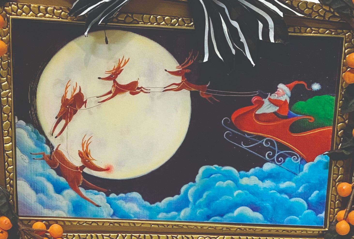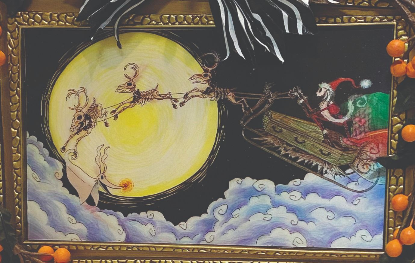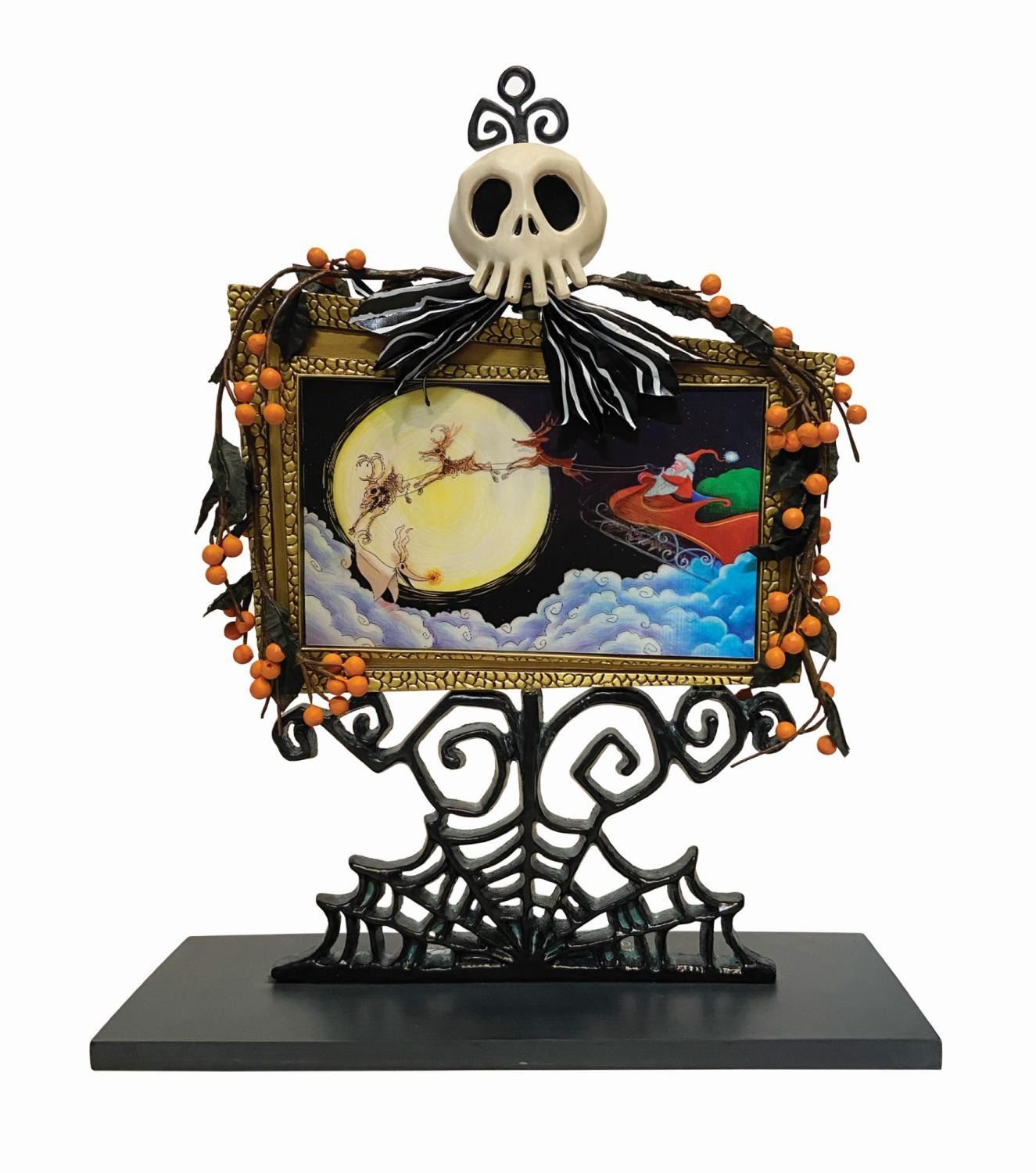 (Disneyland, 2010) A limited edition Jack Skellington transforming portrait display designed by artists Brian Sandahl and Tin Wollweber. Inspired by the prop hanging in the Haunted Mansion Holiday boarding area, the portrait transforms from Santa Claus flying across to the sky with his reindeer to Jack Skellington piloting a sleigh lead by a skeletal team. Created in an edition of 500, the base of the stand retains an edition statement and facsimile artists' signatures. A The Art of the Disney Theme Parks COA is included. Measuring 15.25"x12.5" and 4.25" deep, the piece is in very good condition with only minimal wear. The skull finial is slightly loose.