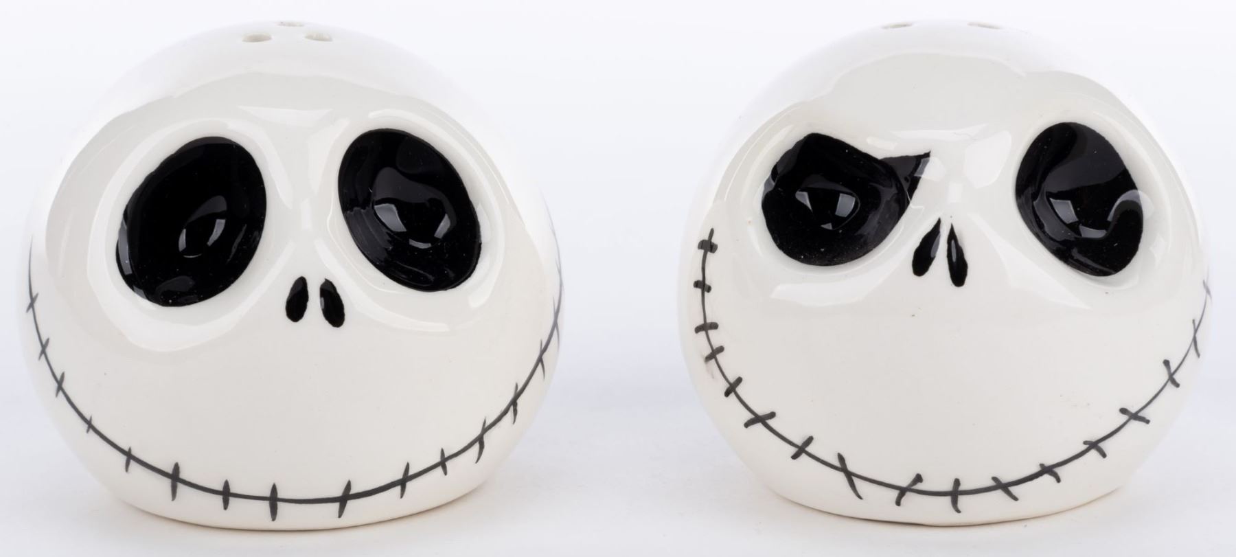 (NECA, 2010) A "Stacked Jack Heads" salt & pepper shaker set featuring Jack Skellington from "Tim Burton's The Nightmare Before Christmas." Each shaker measures 2.75" x 3" x 2.5" and is in fine condition with the original 8.25" x 4" x 3.5" box.