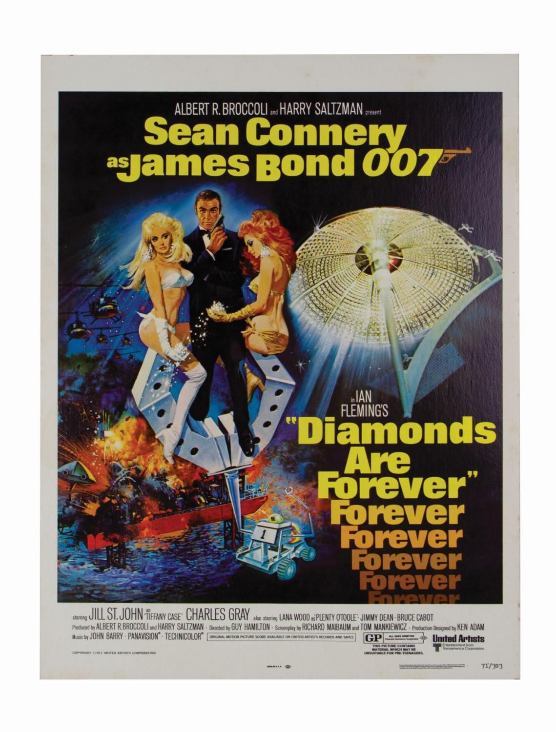 (Eon Prod., 1971) An original U.S. window card poster for the seventh installment in the James Bond 007 franchise, Diamonds Are Forever. Measuring 18"x14" (the playdate field has been removed with a slightly uneven trim), the poster is in very good condition with some faint yellowing in the margins and edge wear.