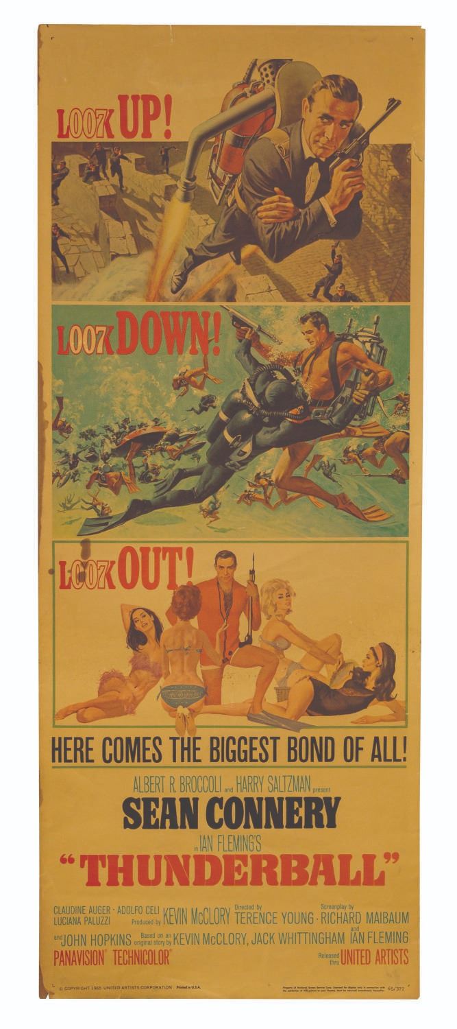 (Eon Prod., 1965) An original U.S. insert poster for the fourth installment in the 007 franchise, Thunderball. Featuring artwork by acclaimed poster artists Frank McCarthy and Robert McGinnis, the insert depicts the suave super spy in the line of duty. Never folded, the poster measures 36"x14" and is in fair condition. There is browning and spot staining, as well as a few small tears and creases.