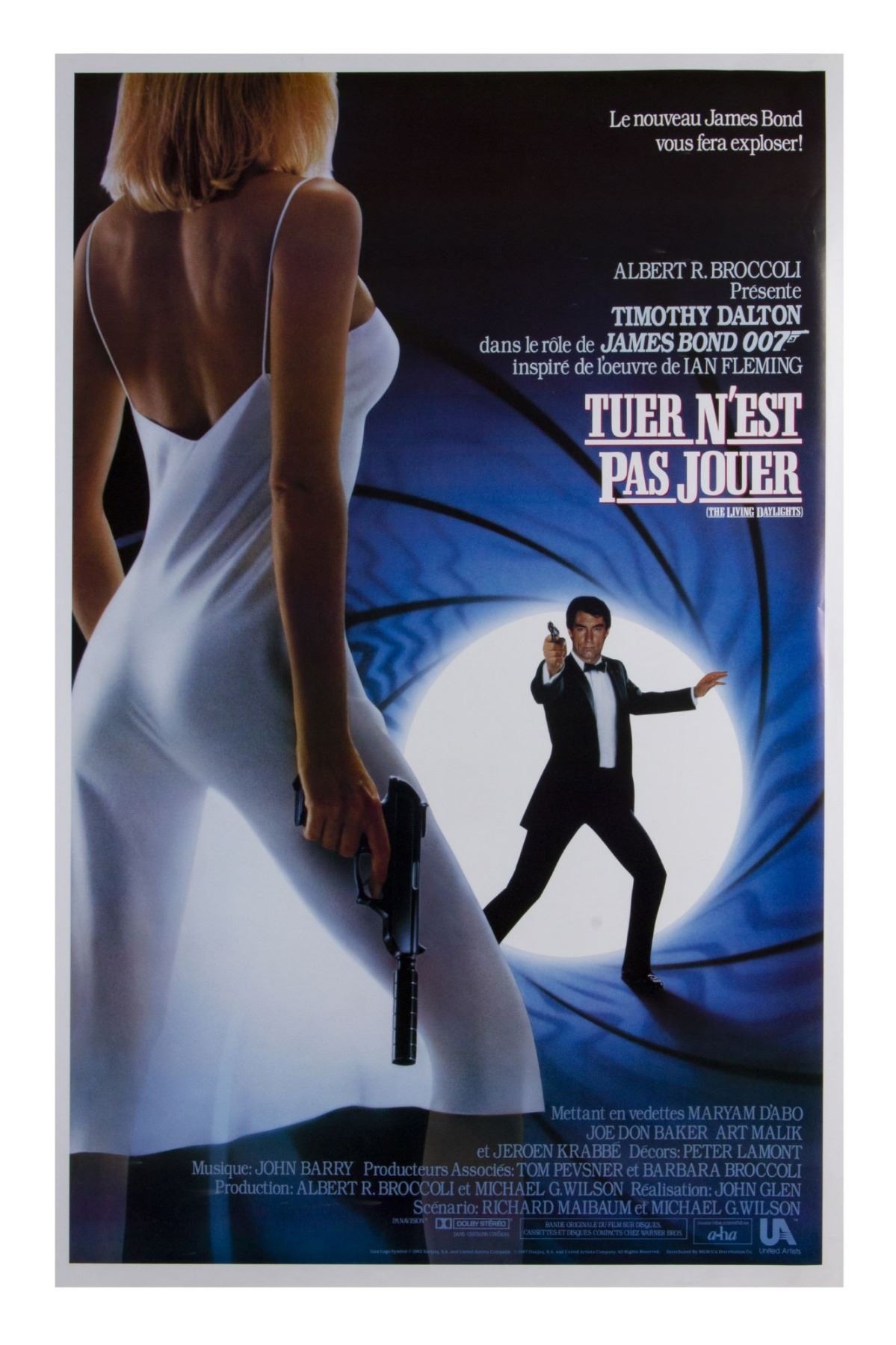 (MGM, 1987) A very rare French poster for the theatrical release of the James Bond film "The Living Daylights". Titled on this poster as "Tuer N'est Pas Jouer", this James Bond film starred Timothy Dalton in his debut as the iconic film character. Beautifully illustrated, this poster has never been folded, restored, or altered, and measures 41"x27". The condition is very good with some wear throughout, including some creasing and small tears within the border.