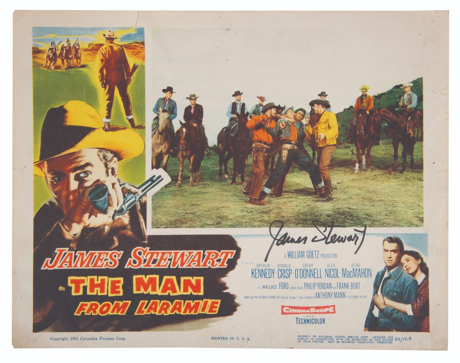 (Columbia Pictures, 1955) A lobby card for The Man From Laramie, signed boldly by lead actor James Stewart. Measuring 11"x14", the card with autograph is in good condition, with light wear from age and handling, pinholes, and a .5" abrasion in the right border.