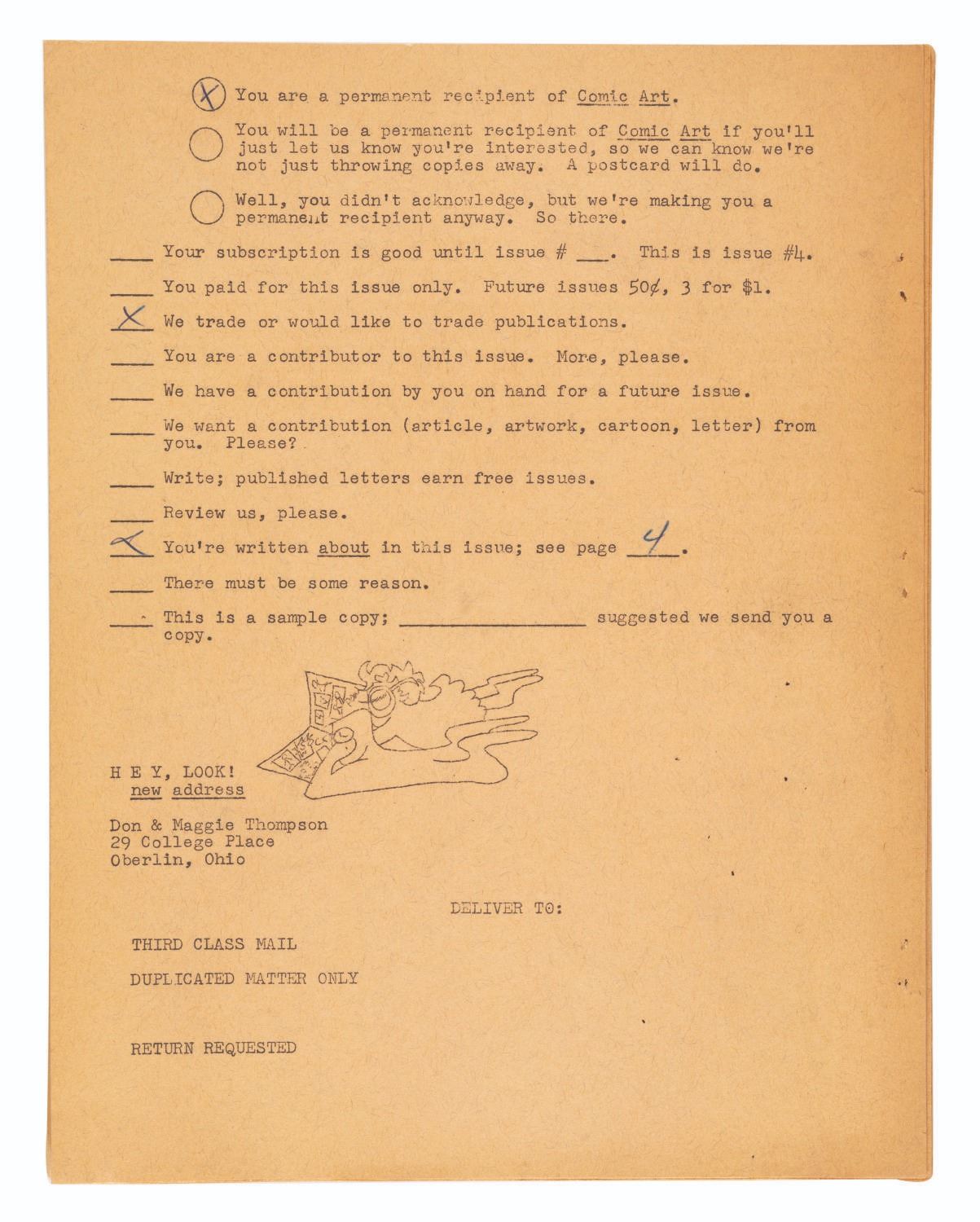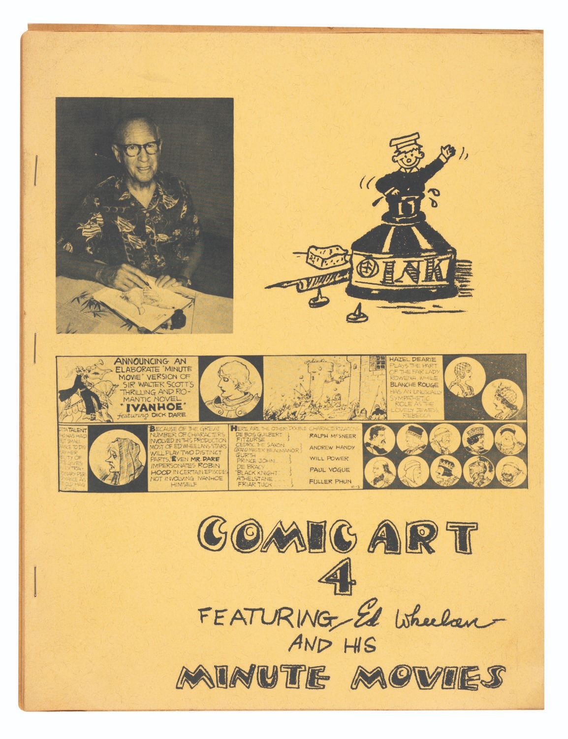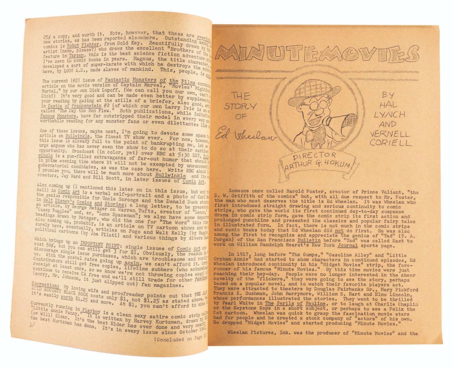 (Thompson, 1962) Jay Ward’s personal Issue #4 of Comic Art, one of the earliest fanzines, by Don and Maggie Thompson. This issue was sent to Ward for the blurb on page 4 promoting his series, “The Bullwinkle Show.” Measuring 8.5” x 11”, the 49-page fanzine is in very good condition with light edge wear, and the last page detached but included.
