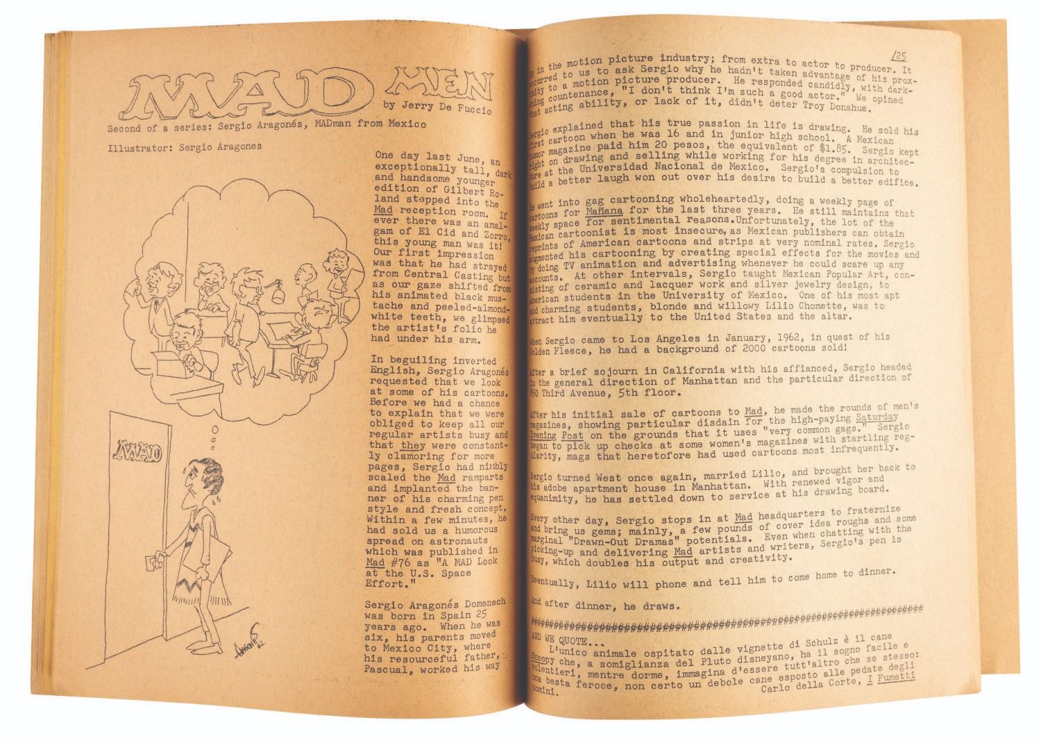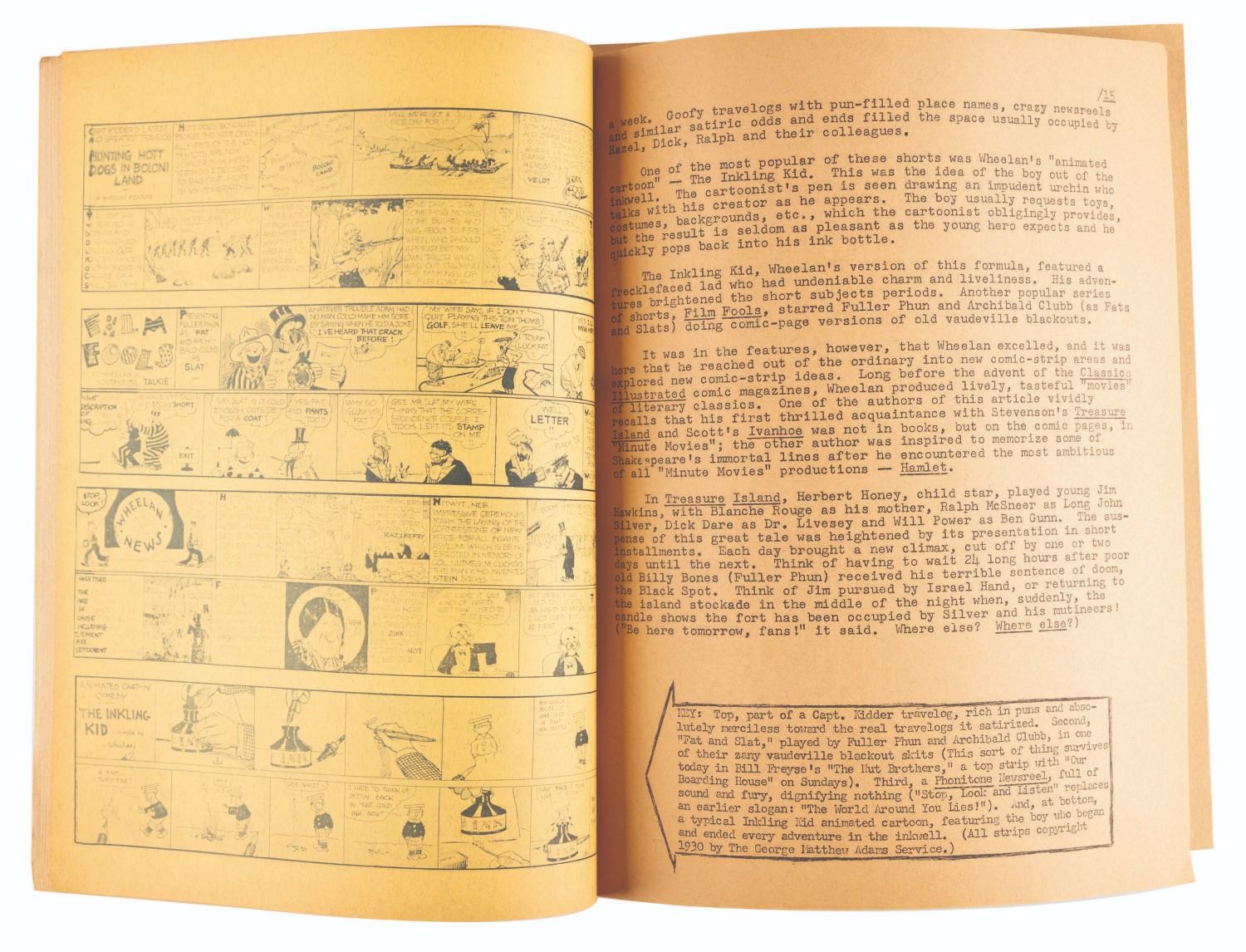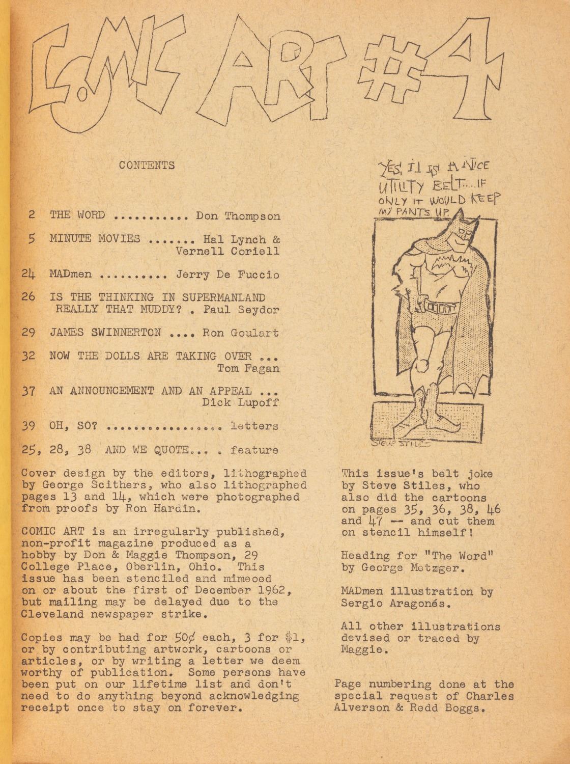 (Thompson, 1962) Jay Ward’s personal Issue #4 of Comic Art, one of the earliest fanzines, by Don and Maggie Thompson. This issue was sent to Ward for the blurb on page 4 promoting his series, “The Bullwinkle Show.” Measuring 8.5” x 11”, the 49-page fanzine is in very good condition with light edge wear, and the last page detached but included.