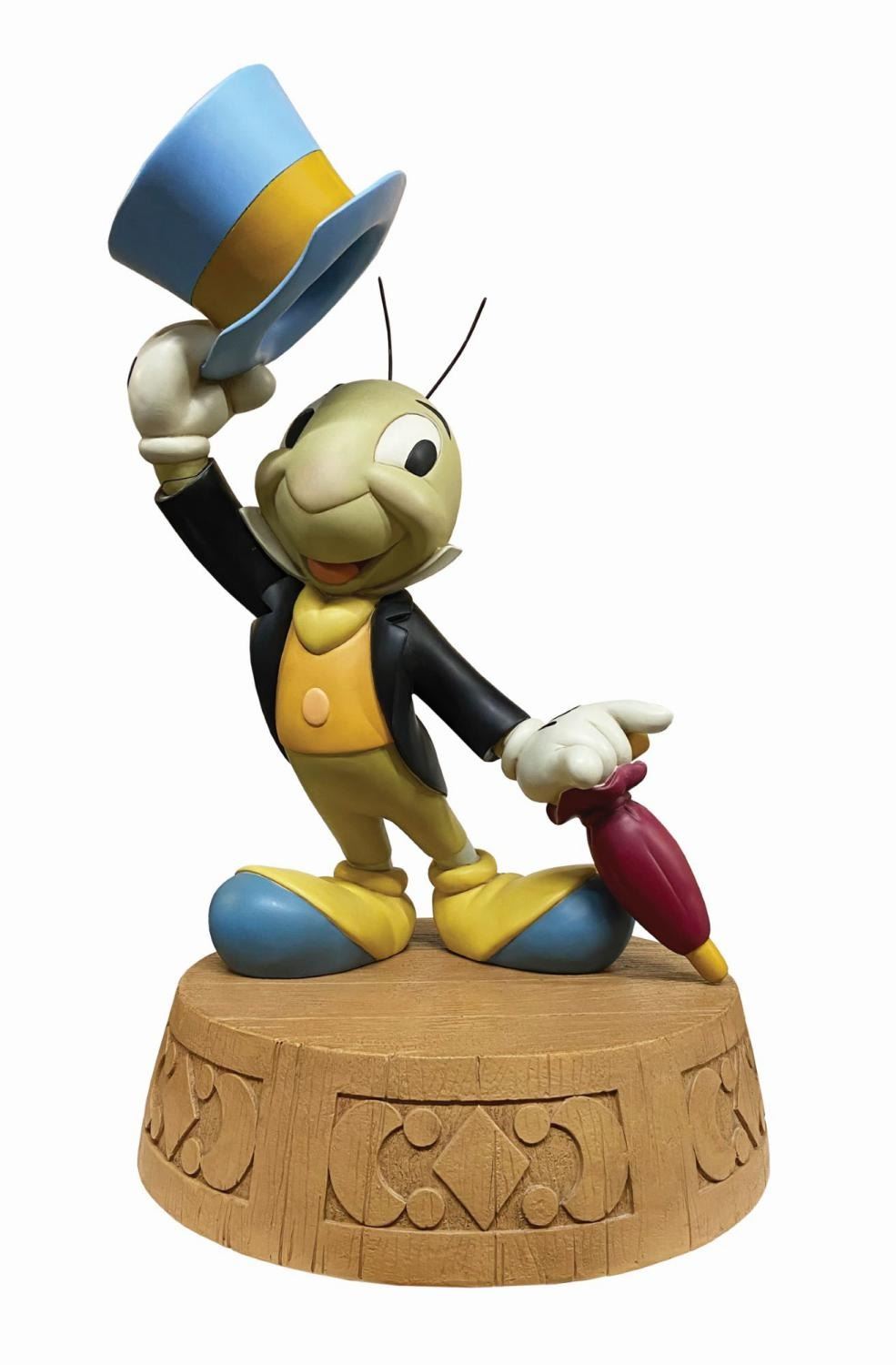 (Disney, 2000s) A very rare Jiminy Cricket figure released in an edition of only 250 pieces. Offered exclusively through Disney Auctions, the resin figure rests on a removable base and beautifully depicts this popular Pinocchio character in a large format. It stands 27" tall including the base. The condition is very good, with a thin crack at the right wrist, however the hand is still firmly attached. This item may require special shipping arrangements, please inquire for details and estimates.