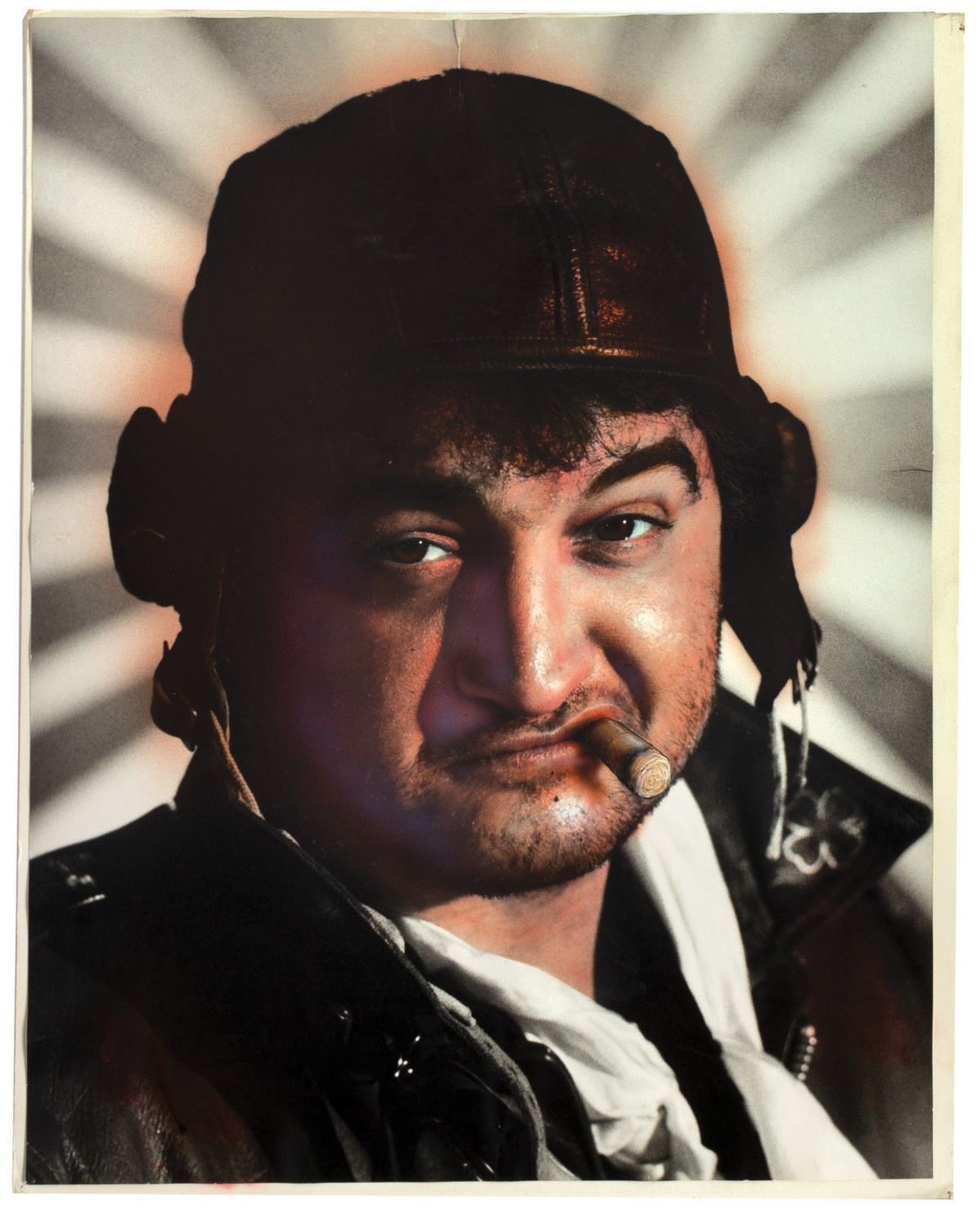 (Universal, 1979) This enhanced photo artwork was created during the development of promotional materials for Steven Spielberg's wartime comedy film, 1941. Depicting John Belushi in his role as Captain "Wild" Bill Kelso, the artwork consists of a photo print of Belushi that has been heavily enhanced with airbrush and acrylic to achieve the desired look. The artwork comes from the collection of renowned illustrator Peter Green, who was hired by Spielberg to create promotional artwork for the film. Measuring 20.25"x16.5", the artwork is mounted to art board and is in good condition with some rippling and creases to the paper along the edges.
