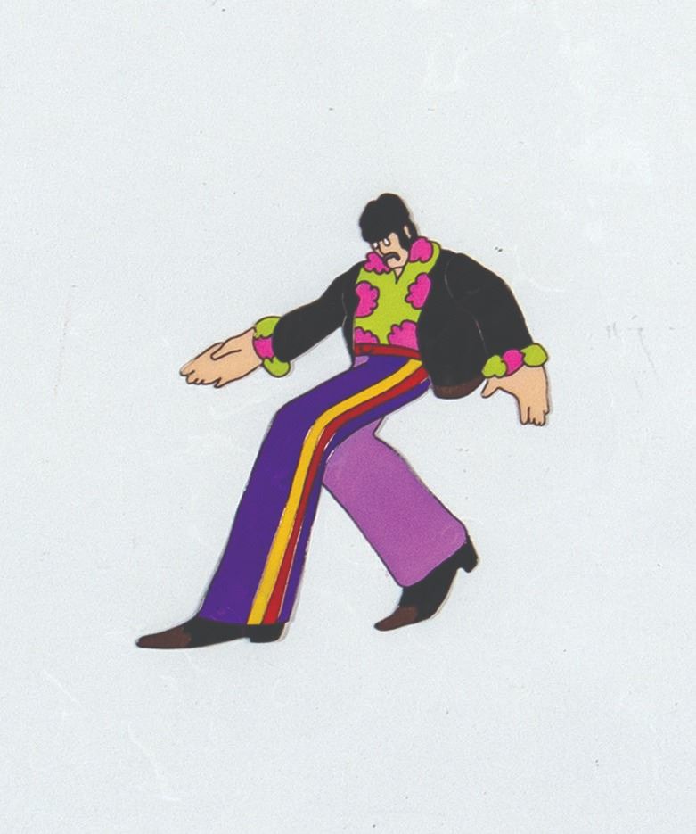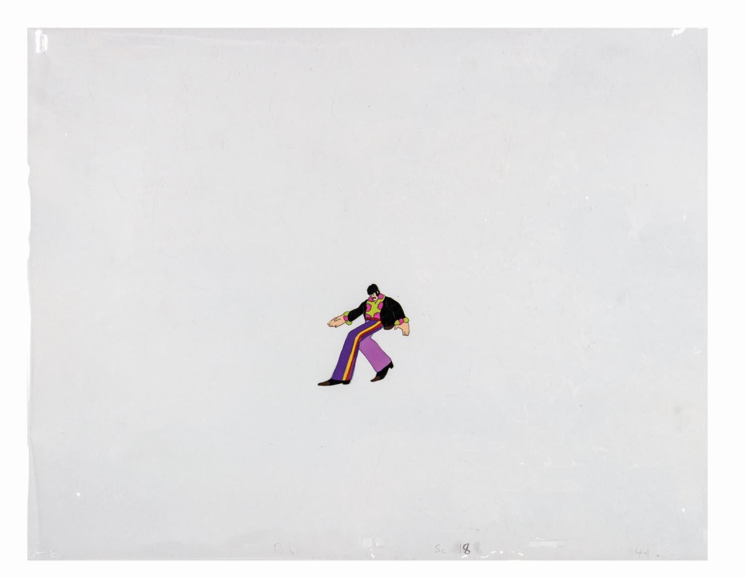 (King Features, 1968) An original hand-painted production cel from the Beatles animated feature, Yellow Submarine. The cel depicts a small full-body image of John Lennon. Measuring 12.5"x16" with an image size of 2.25"x2.25", the cel is in very good condition, exhibiting a slight waviness to the cel and staple marks at all four corners.